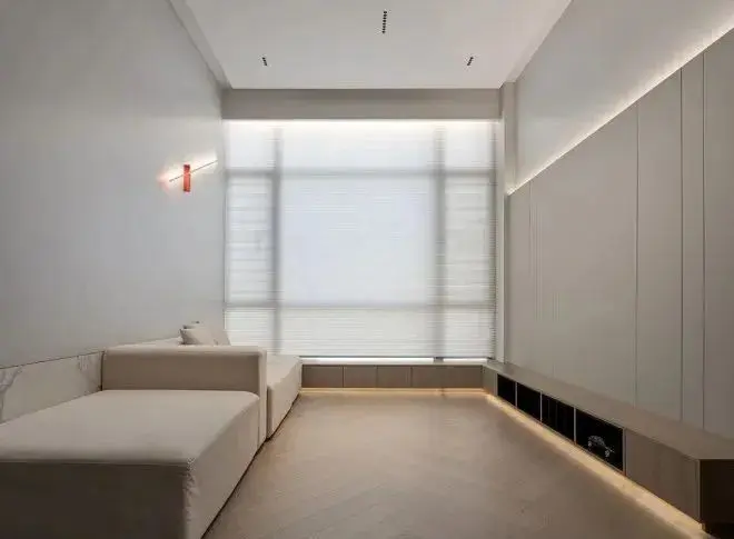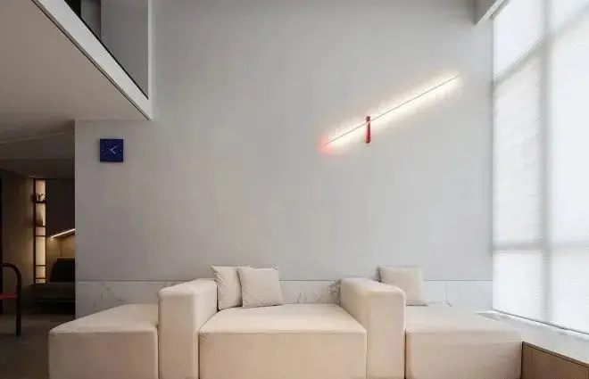 由于整体空间比较小,所以大面积运用浅灰色系,利用极简的风格与线条,整个客厅看起来更加干净,不至于显得局促杂乱。此外,设计师还在全屋设计了智能灯光系统。如此一来,可以根据不同的时间和场景,选择最适合的灯光氛围。这个家,有一个值得有孩家庭借鉴的小细节——沙发墙背后做了半高的岩板墙。家里有孩子,难免会喜欢涂涂画画,岩板墙更加耐脏,不同的材质也增添了新鲜感。