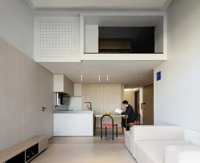 在餐区的上方,有一个夹层空间。设计师考虑到3.8m的层高优势,就增加一个夹层空间。它集设备间、储物间为一体,实用性非常强,非常适合这个不大的家。