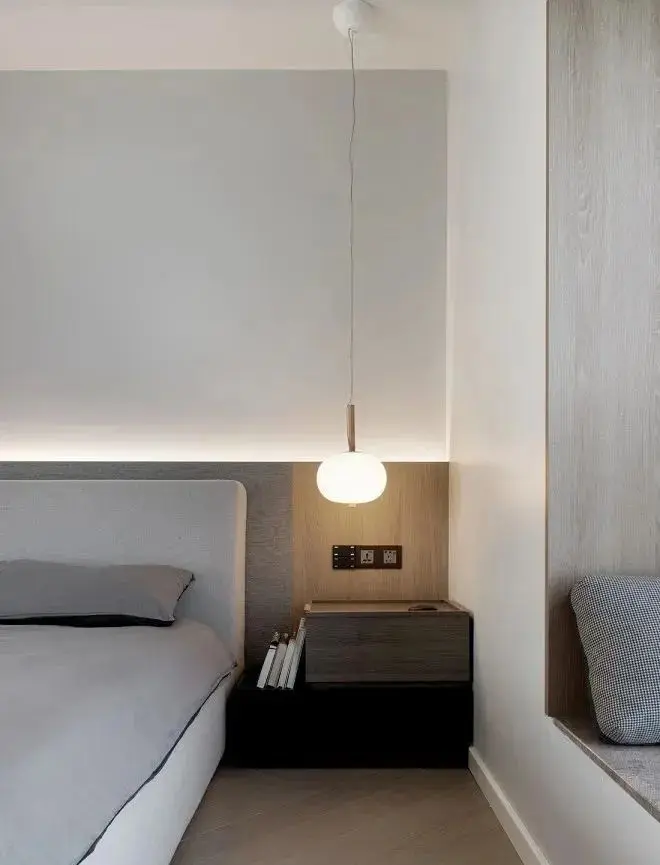 床头选用组合式床头柜,上下可灵活移动,利用凹位放置常看的书。床头灯则满足了屋主睡前阅读的习惯,向外发散的灯光营造出温馨的氛围,为整个卧室增添了一份温暖。