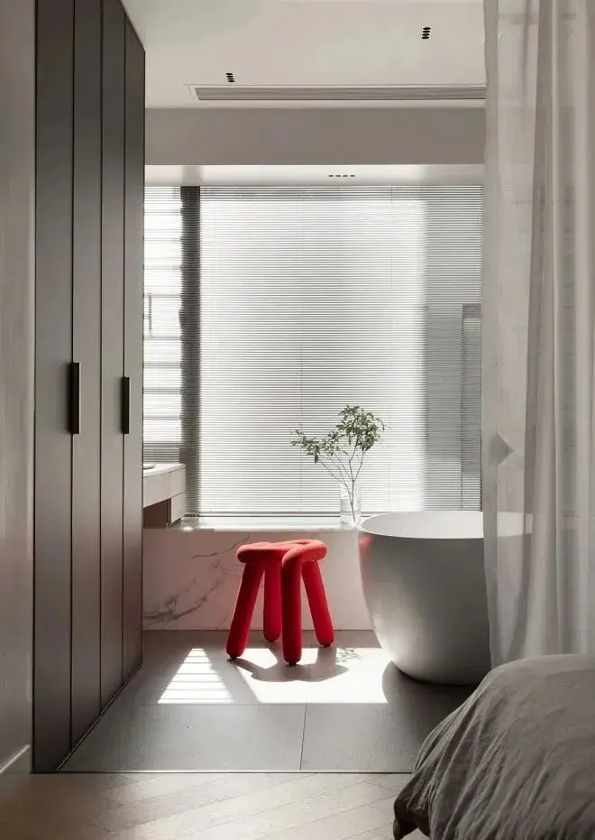 设计师将两个不大的卧室打通变为一个卧室,做了一个功能更加完善的套卫——主卫、浴缸、衣帽间、飘窗全都有了。