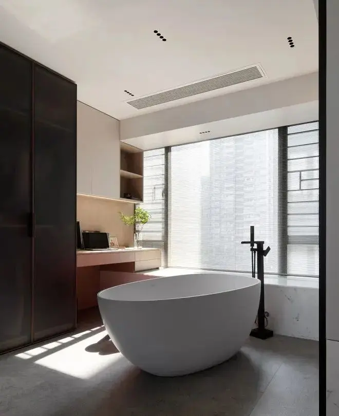 这里既是主卧的阅读区、衣帽区也是浴缸区。鹅卵石形状的人造石浴缸灵活可变,地面也做了全面防水设计。