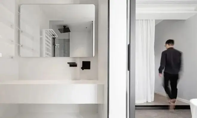 浴缸的一侧,是主卧卫生间。这一片区域选用纯白的台面搭配黑色的五金,简约有质感。