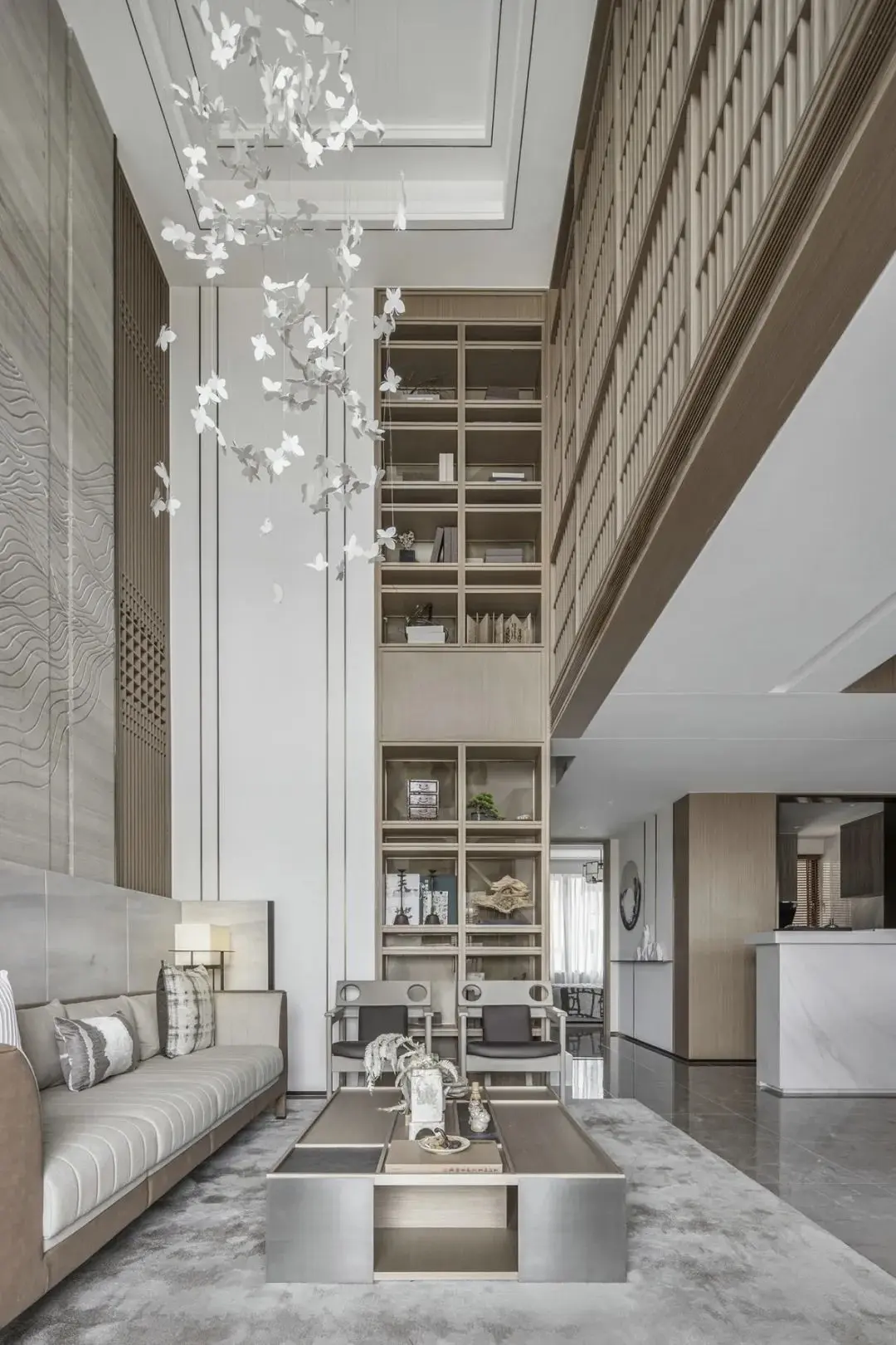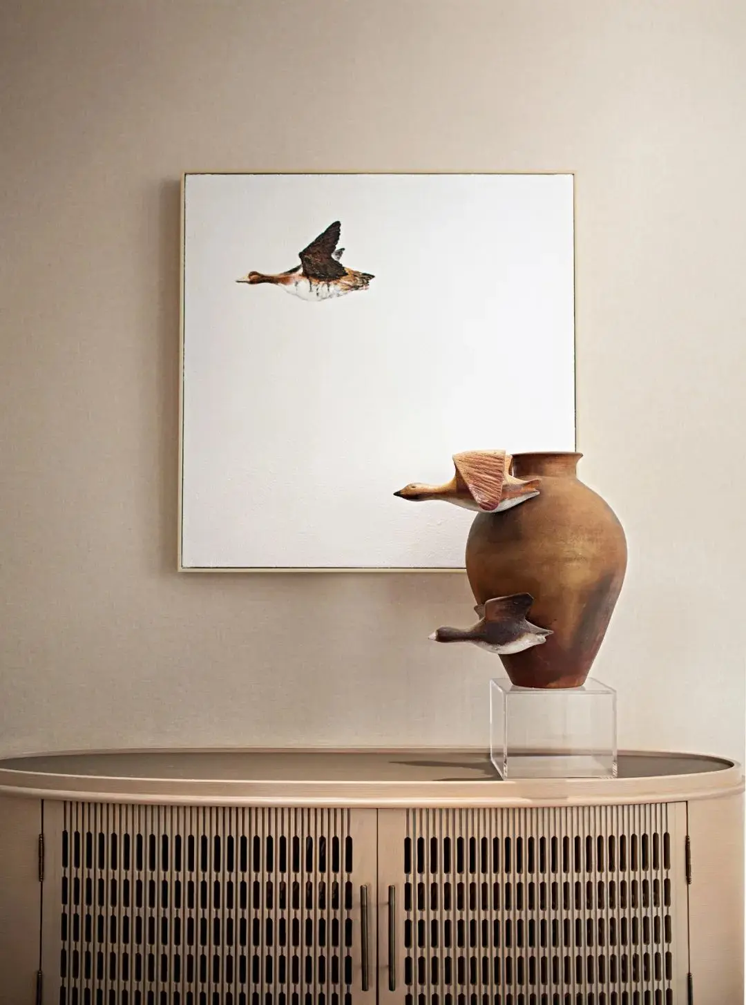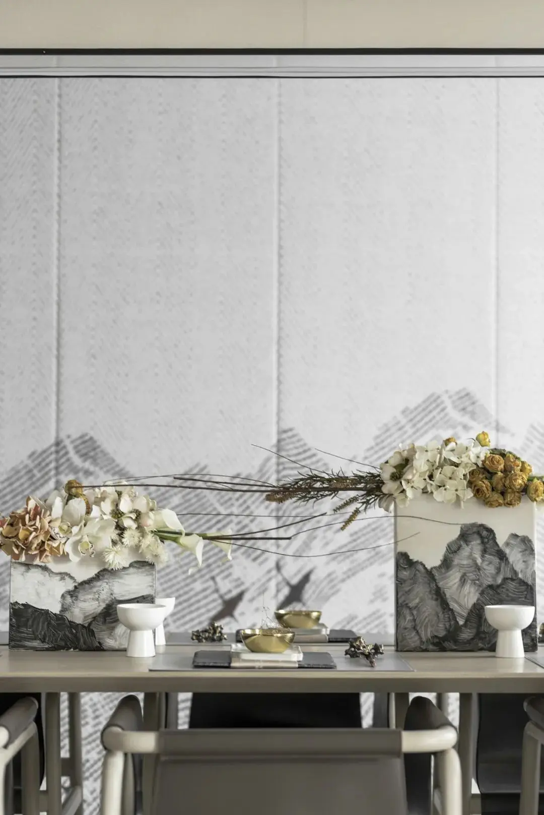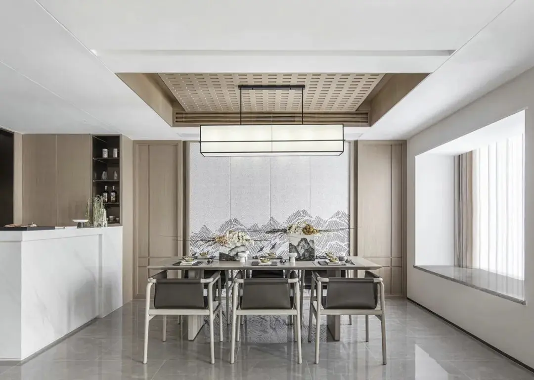 一步入玄关,“江涵秋影雁初飞,与客携壶上翠微”之景在众安宁静一偶静静等待着观者的到来。闭眼仿佛可听长空雁叫,睁眼隐然可观万羽翩跹,虚实相生是造景和装饰画的主色,这是一场空间和时间的对话。