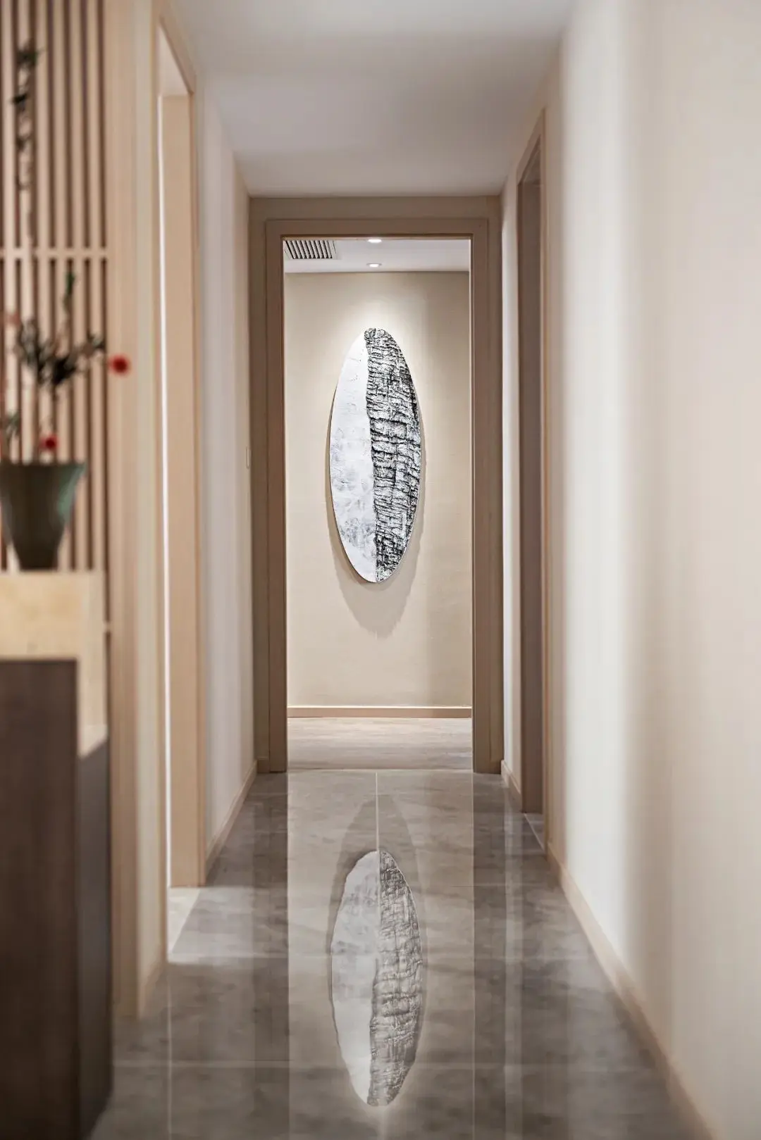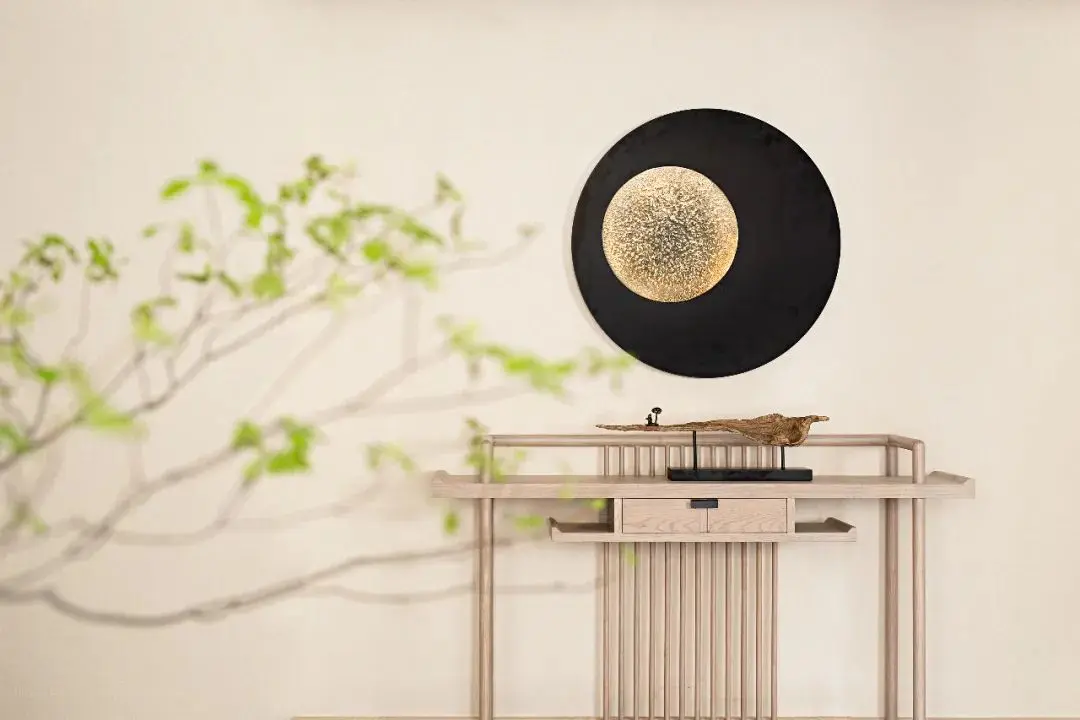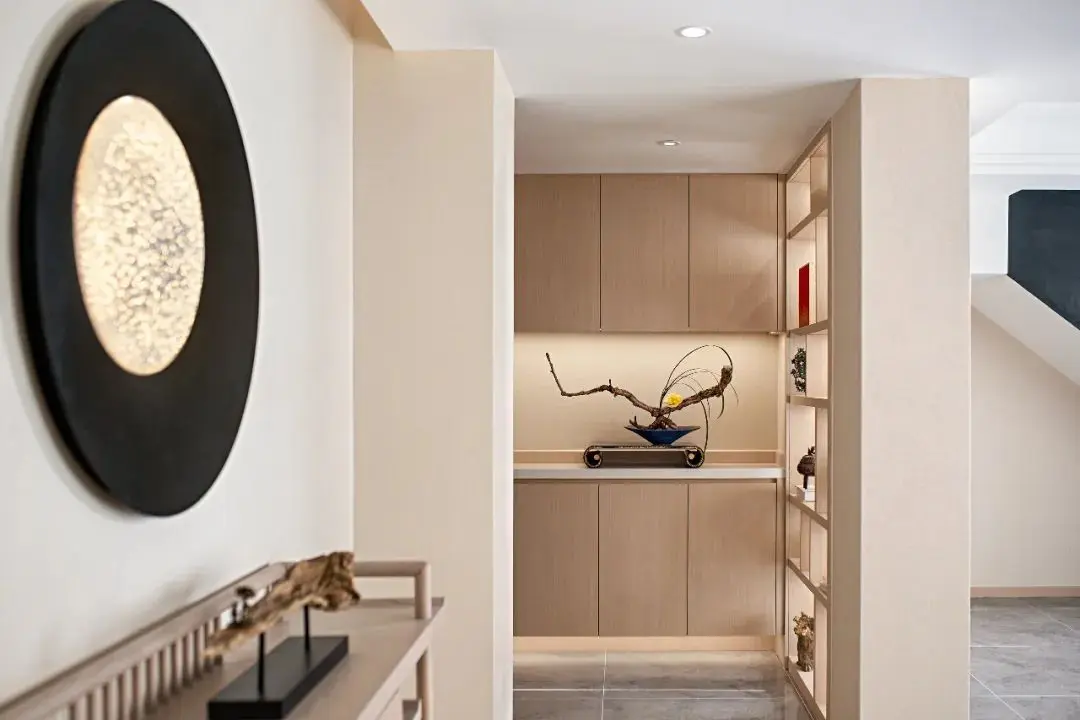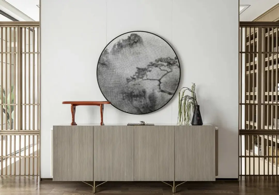 木质栅格分割走廊动线,透而未透的状态让整体空间藕断丝连,顶端的圆形挂画为走廊注入暖色。宣纸拼贴画,以手工的温度,将纸张不断糅杂、打散,再拼贴、粘合,纸张被重新诠释,形成新的画面,赋予另一种新生。