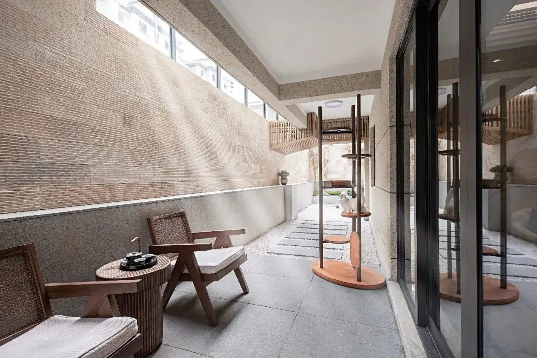 一侧采光窗的开辟,将负一层的光感激活,阳光或月色,流泻而入。猫屋的置入极大丰富了空间的趣味与活力,为整个空间带来丰富的生活气息。沉稳的色泽赋予空间简雅悠然的格调,以凝练的笔法抒写日式禅意生活的自然雅致。