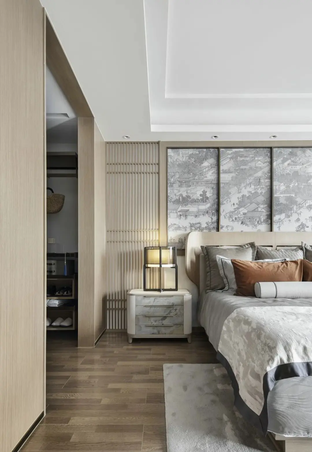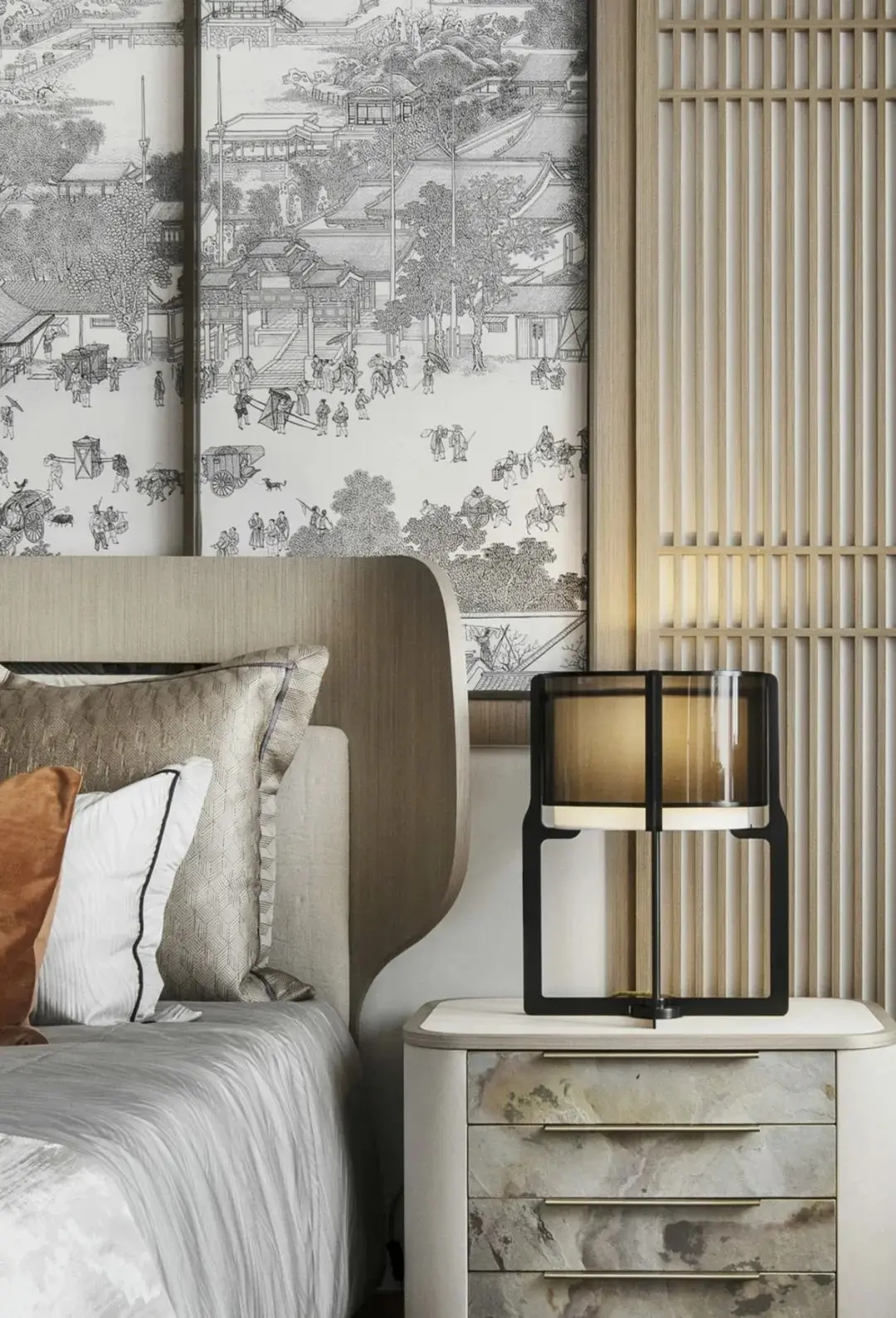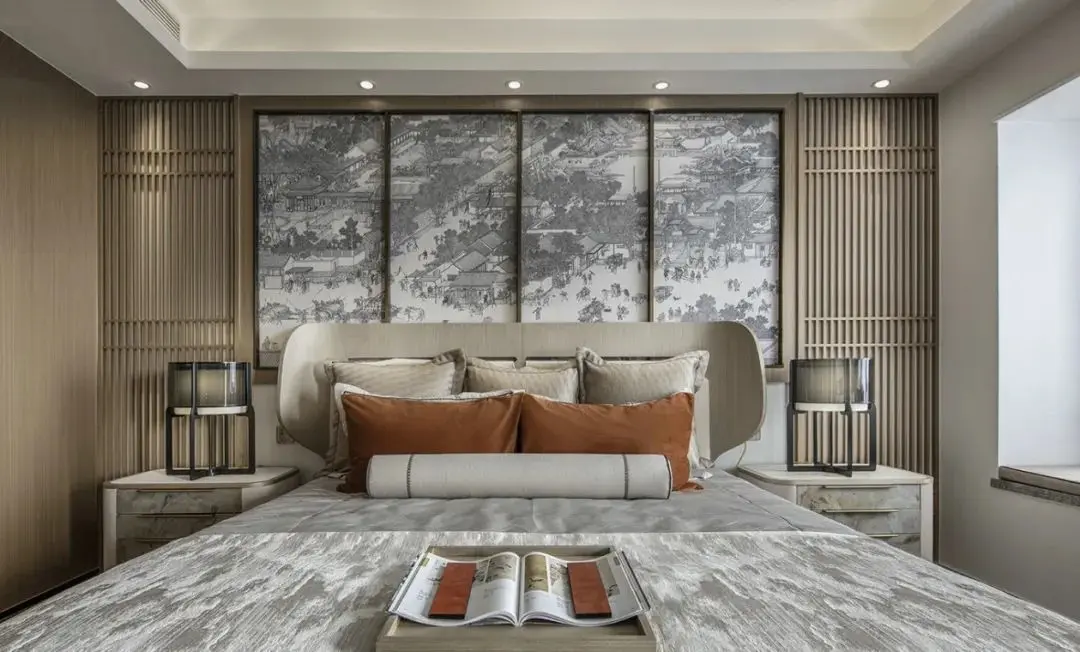 卧室背景以一幅风俗画徐徐展开,浅色木饰面为基调,搭配富有自然肌理感的石材家具,碰撞出富有人文气息且具现代品质感的诗意禅韵。