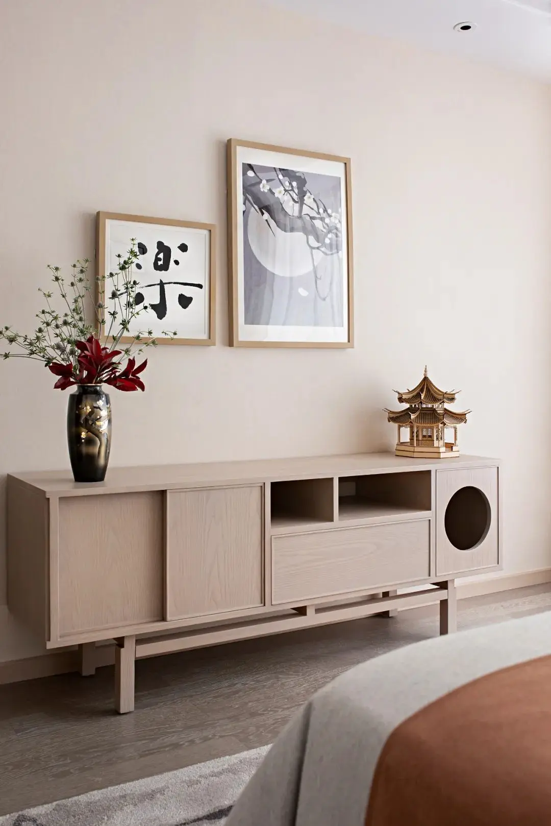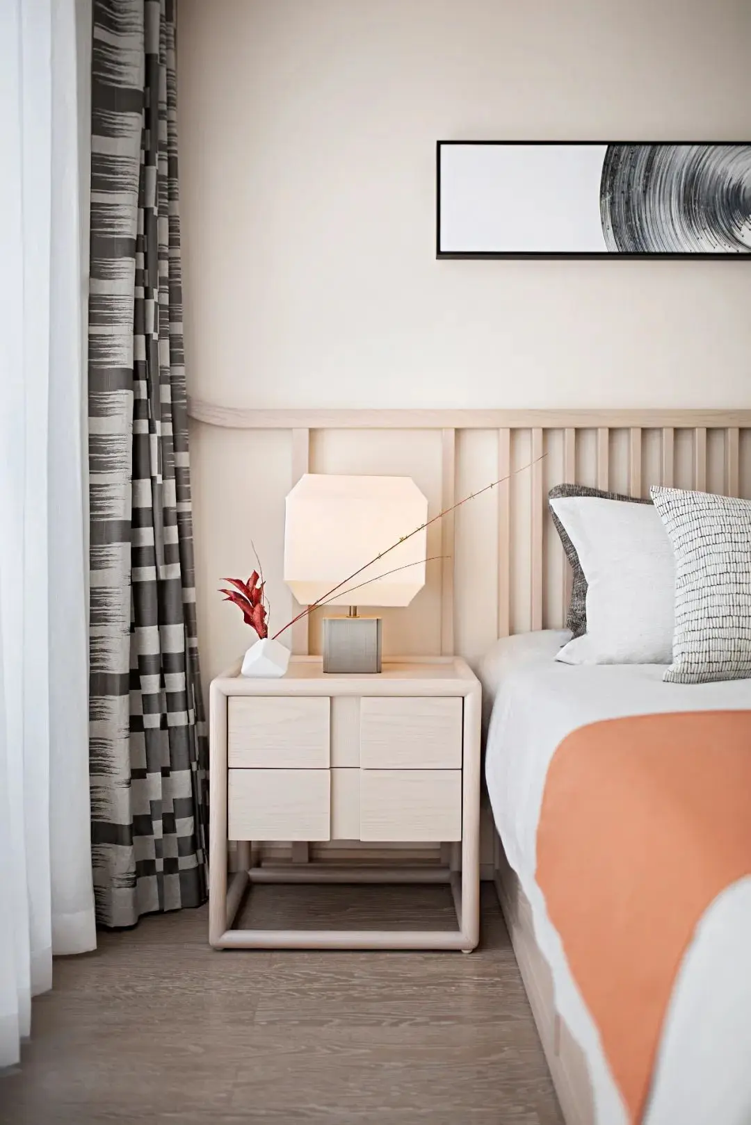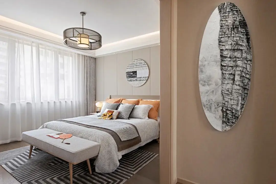卧室背景以一幅风俗画徐徐展开,浅色木饰面为基调,搭配富有自然肌理感的石材家具,碰撞出富有人文气息且具现代品质感的诗意禅韵。