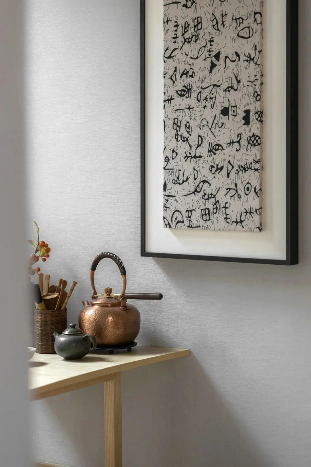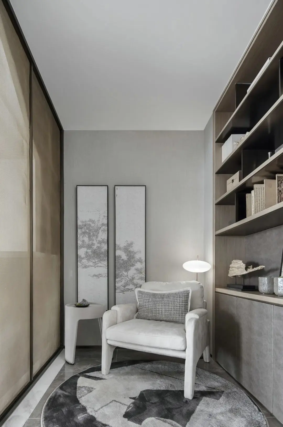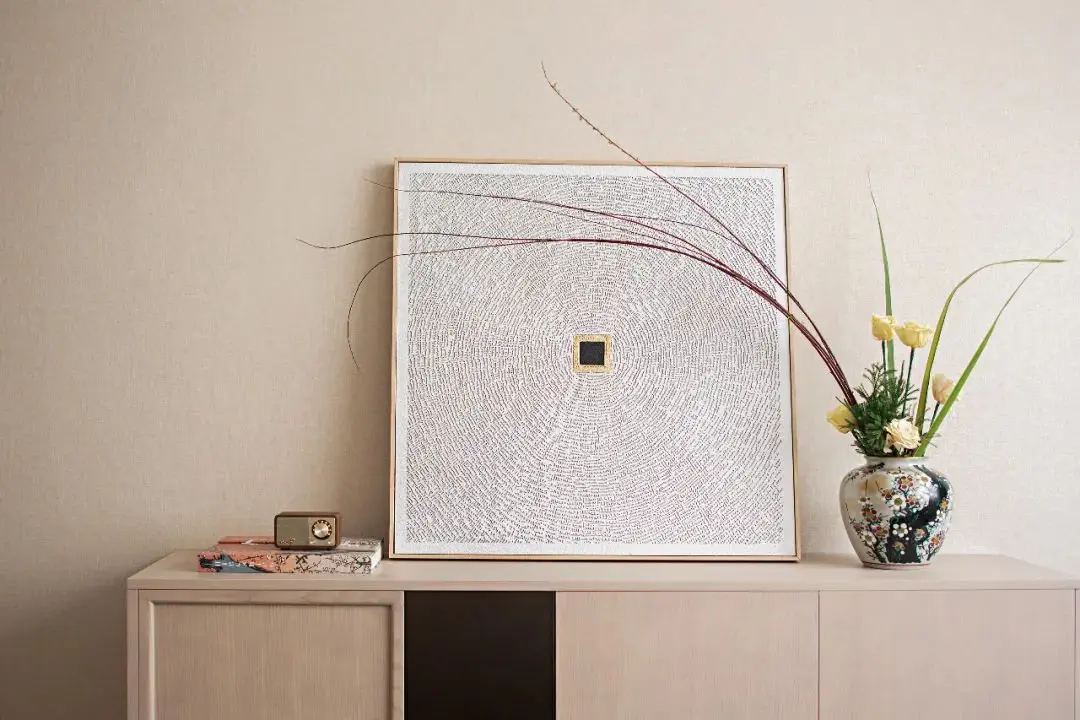 阅读使人闲适,墨香使人静宁。几本日式书籍,充满禅意的几处细枝绿叶,同样散发着温度的宣纸拼贴画,足矣营造出居住者憧憬的生活向往:坐看云起,展卷闲茗,诗意栖居,方寸净明。