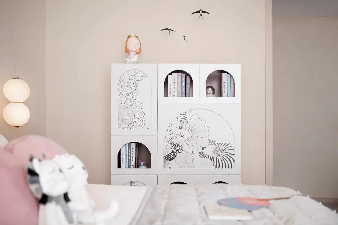 粉蓝色统筹着女儿房的空间视觉美感,各式各样可爱精巧的摆件陈设,线条丰富的家具搭配,在空间中对话碰撞,表现出饱满而趣味的明快气质。线条简约的和风柜面装饰和挂画,掩映着柔和的粉色色调,贴心匹配小女儿活泼可爱的格调喜好。
