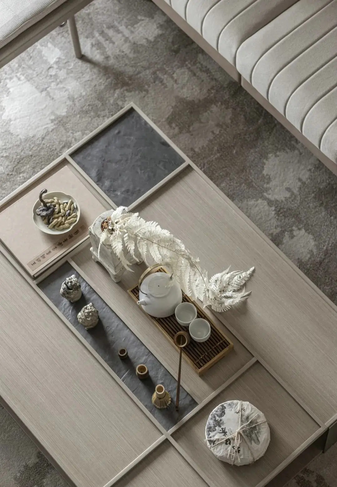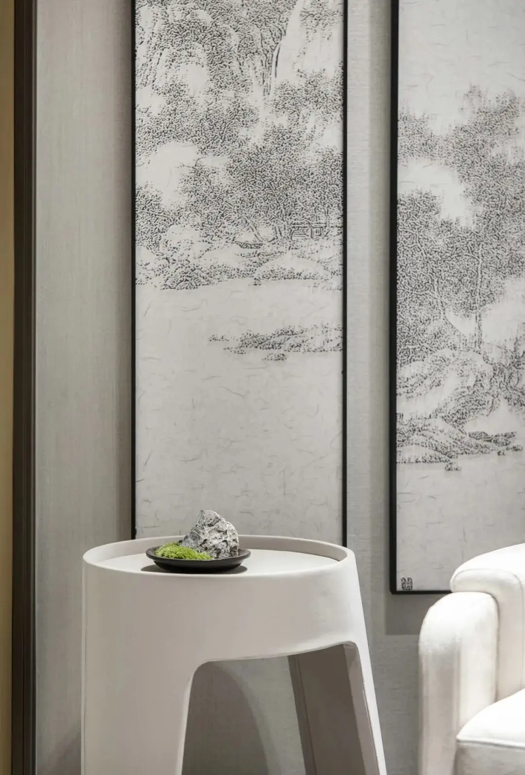 整体的浅色灰调,在色彩的选用上延续黑白灰为主,点缀绿色。软装材质以实木,棉麻,皮艺为主,搭配玻璃,天然大理石,无指纹金属等天然材质为辅,利用花艺进行点缀,以契合室内空间中的气质——一种在韶华轮替中始终保有的从容与安详。