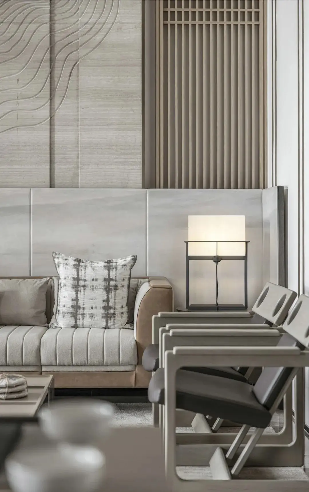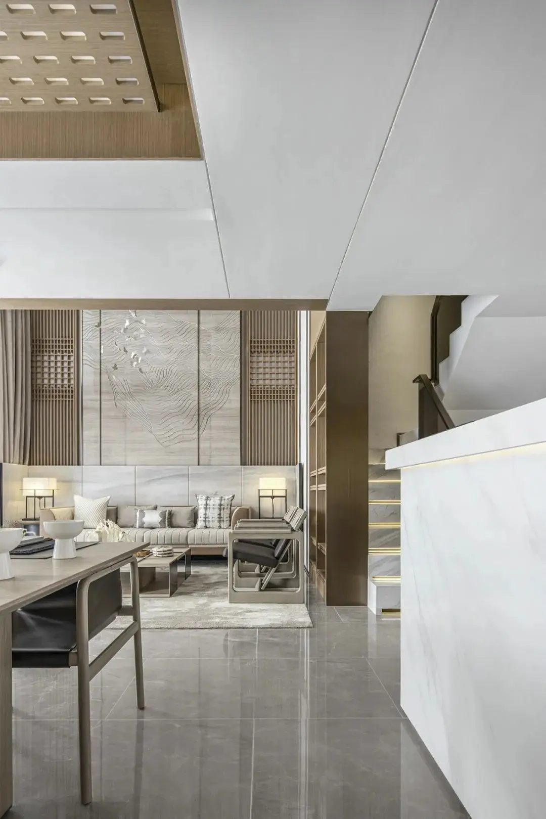 一层含有接待、聚会功能,在这层强调回归文韵礼序的宁静致远。就空间整体风格而言,偏向现代简约,设计语言采用直线条为主,块面的分割,给人通透干练的感受。
