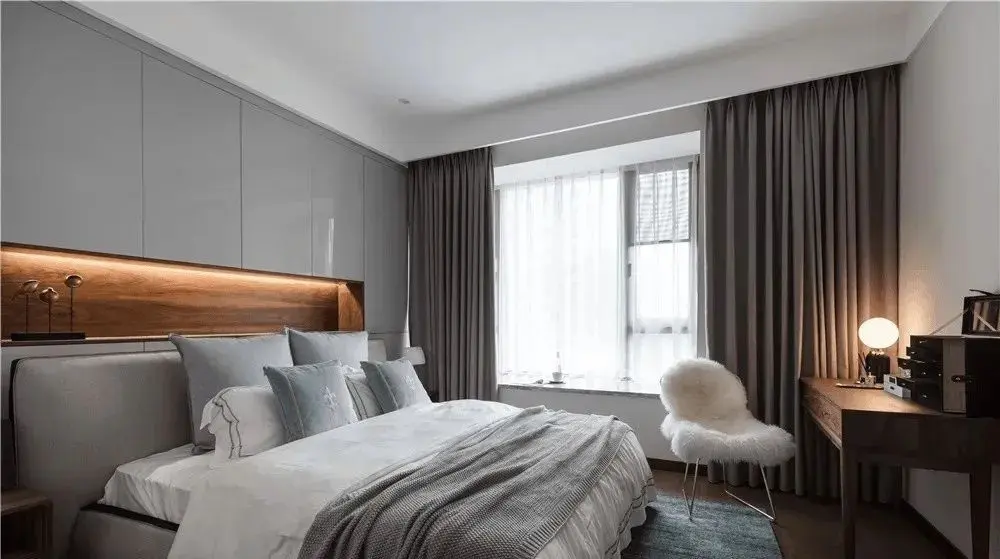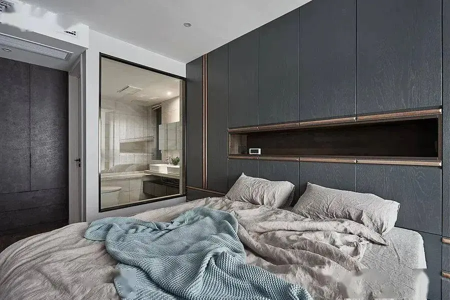床头后侧柜,简单来说就是将床头板“变胖”,或者设计成一个柜子,一般来说都是25到30公分。柜子上方作为一个开放式的空间,可以摆放书籍、相册等东西,充当床头柜的作用,而柜子里面也可以用于房间物品的收纳。