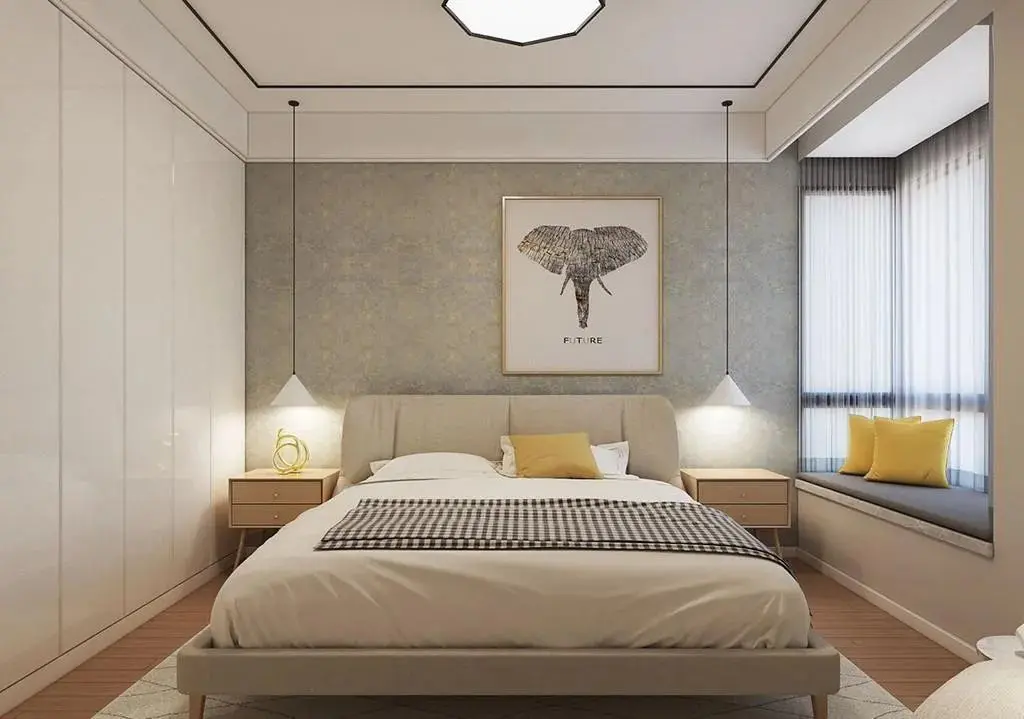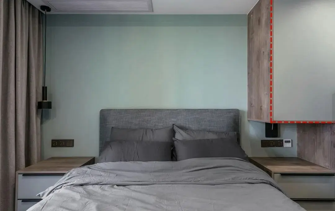 如果空间允许的话就在两侧都安装柜子,床头上方安装一组吊柜,让整个墙头嵌入柜体,给人一种被包裹的感觉,安全感十足,并进一步增大了储物量。