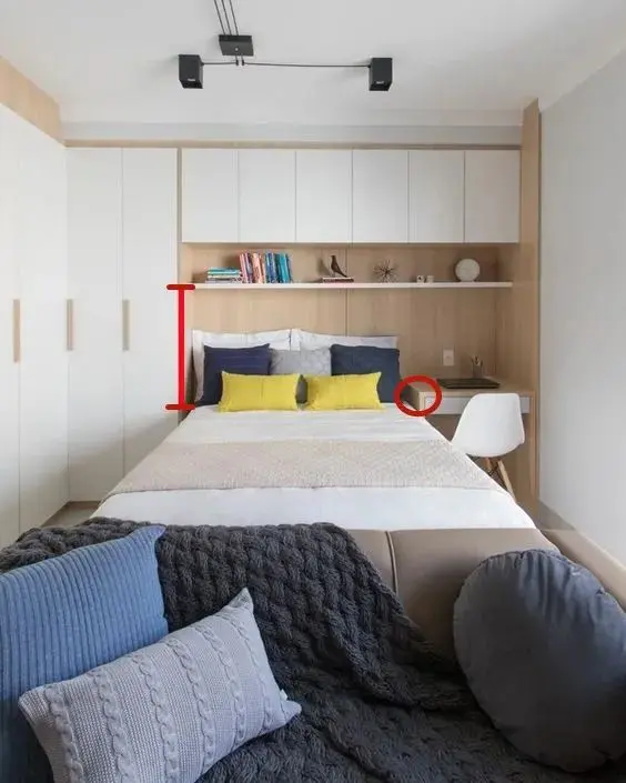 注意床头照明,如果在床头的上方安装了柜子肯定遮挡住床头的光线,所以需要考虑到照明问题。在吊柜下方安装灯带或者在床头的墙壁上安装壁灯都是可以的,所以在安装之前预留好线路插座和开关。