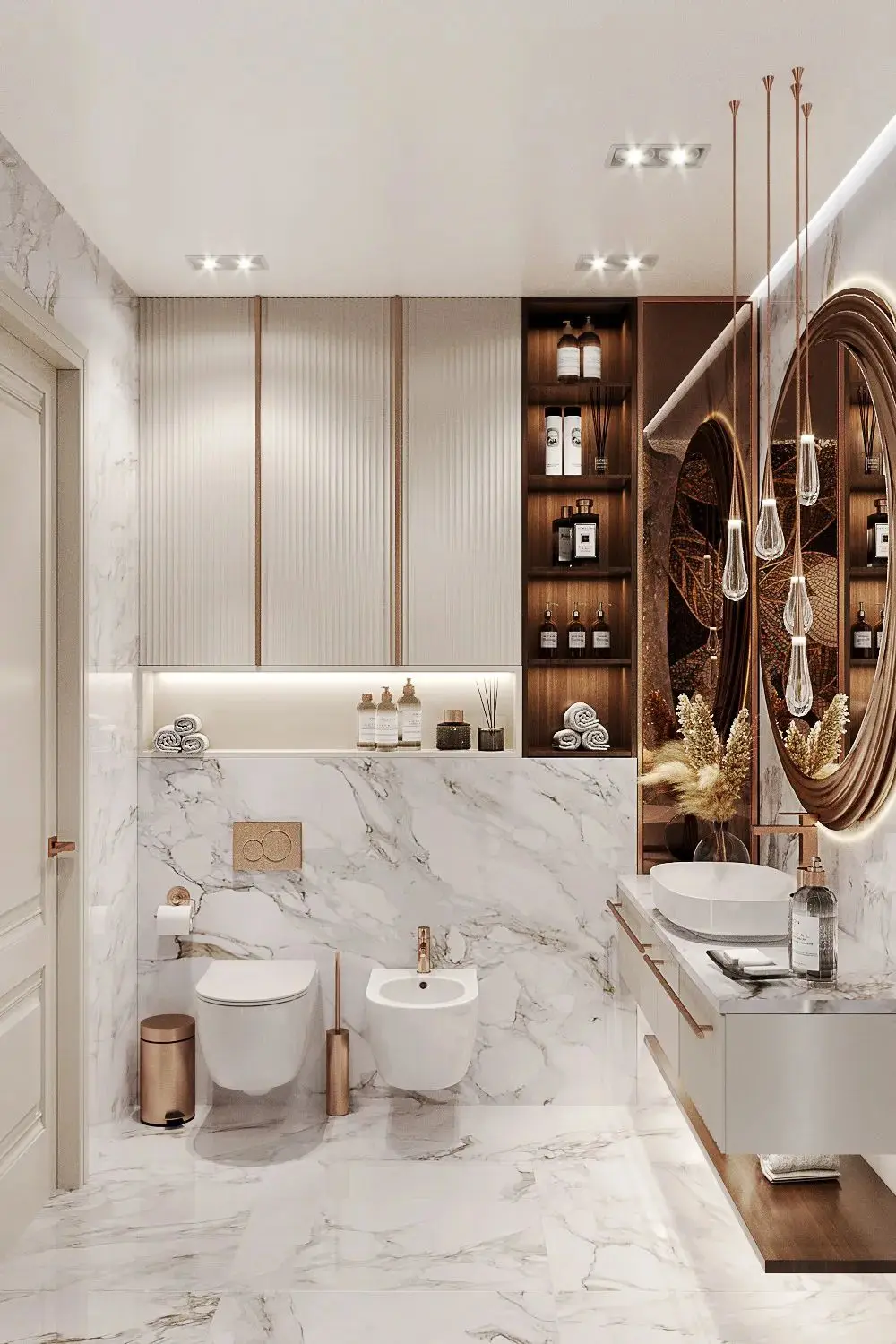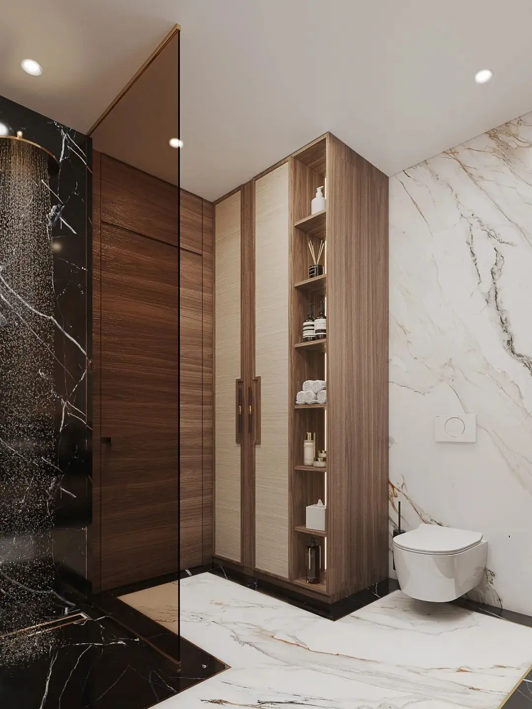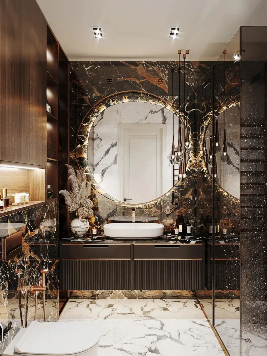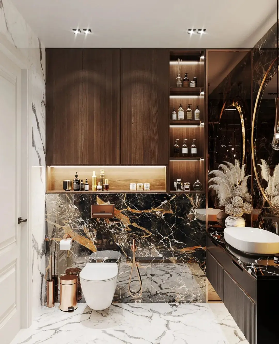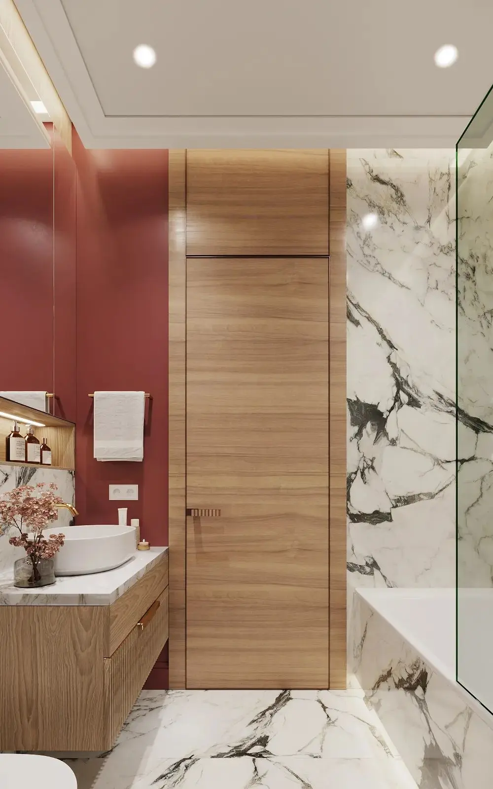 大理石+红色装饰的卫生间,既高级又养眼,同时以轻奢风的搭配,充满优雅质感,散发出不可抗拒的魅力。