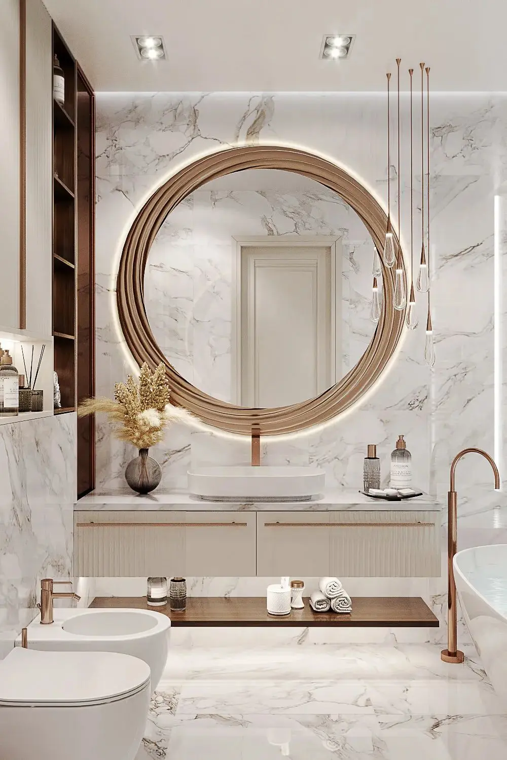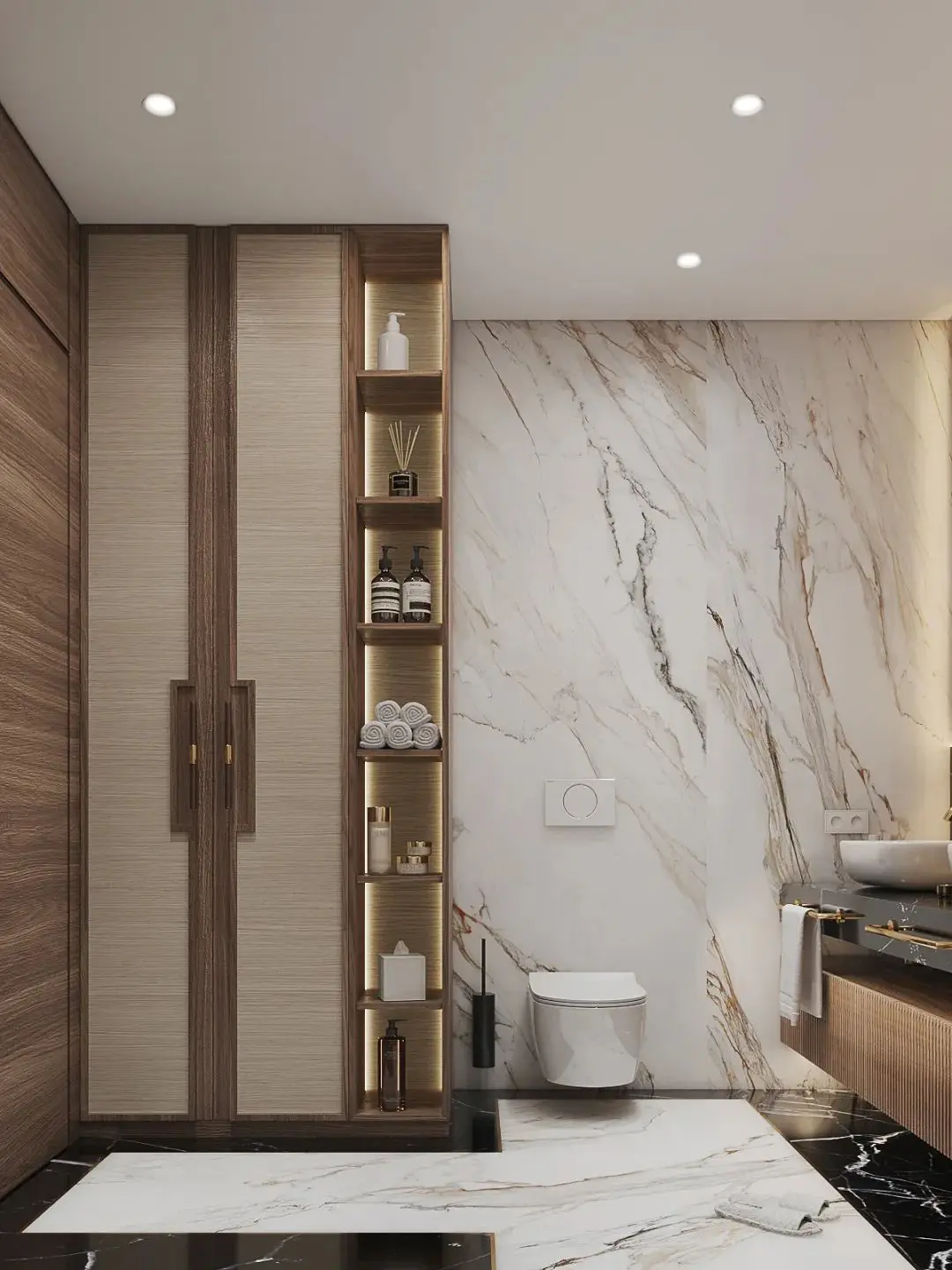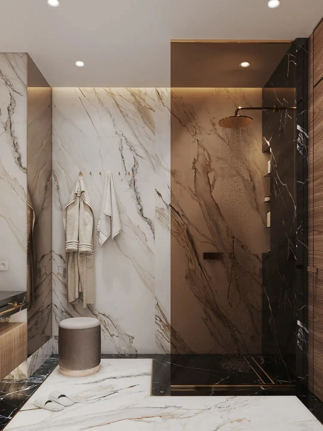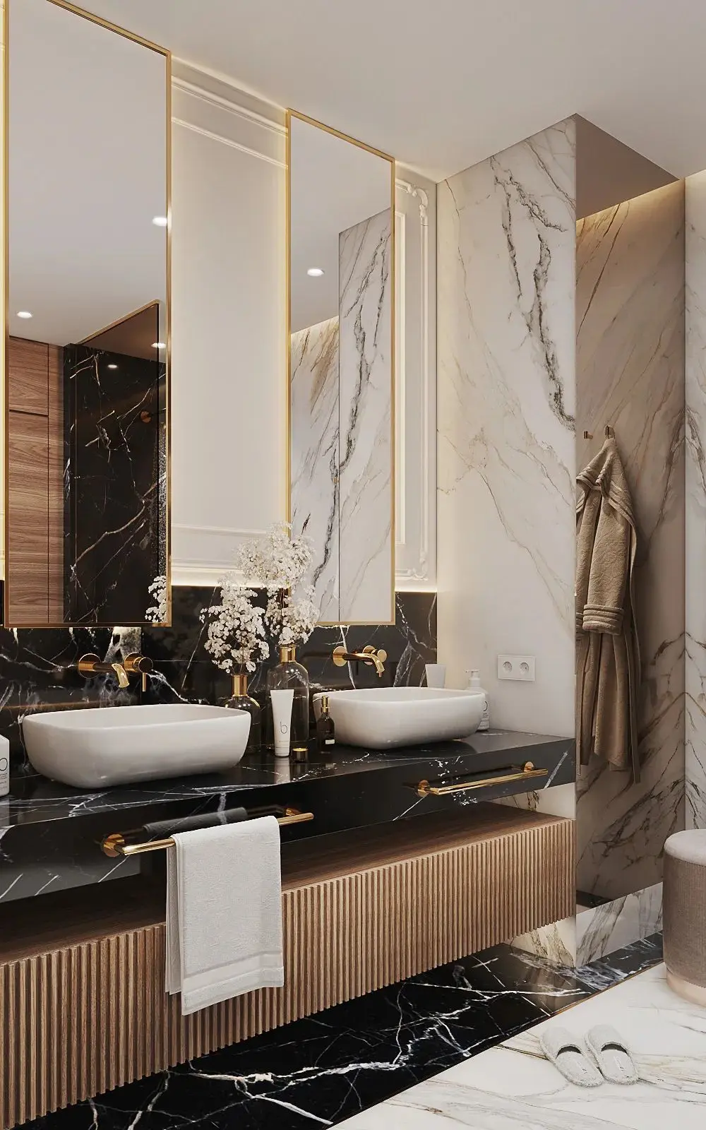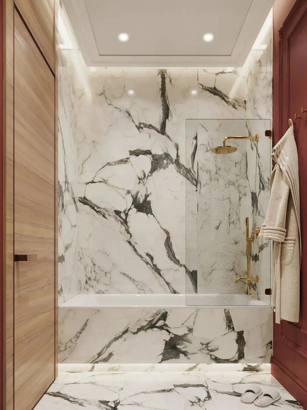 大理石+红色装饰的卫生间,既高级又养眼,同时以轻奢风的搭配,充满优雅质感,散发出不可抗拒的魅力。