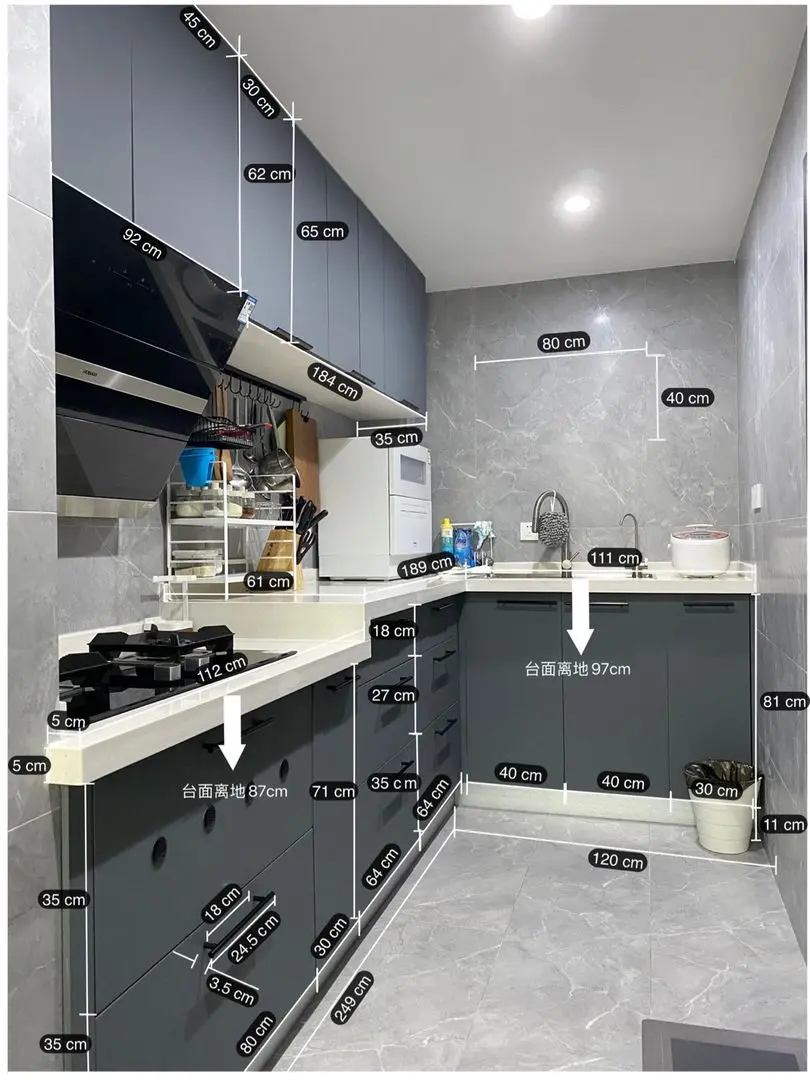 橱柜是高低台面设计,水槽区和操作区是97cm,灶台是87cm。比设计的高了2cm,应该是算掉了台面石英石的厚度。