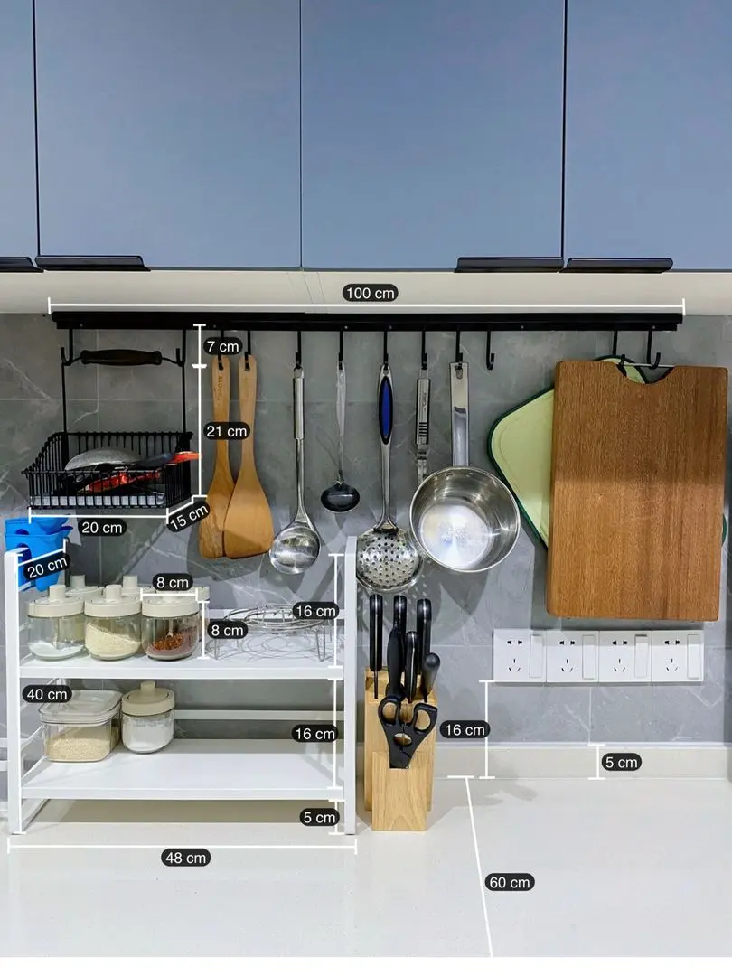 操作区才进行了小部分改造,小U最喜欢的就是置物挂钩。因为挂钩是从杆子中间插进去的,所以上方不需要留空间,小U就直接贴橱柜底安装了。这样挂东西就不会显得太矮。
