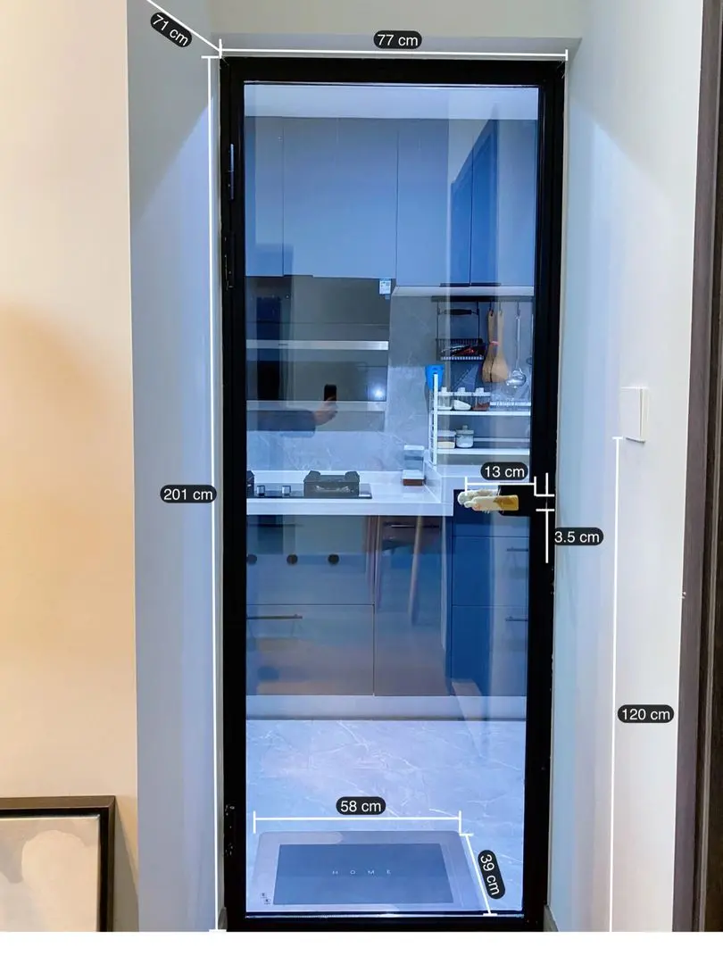 厨房门是做的这种透明玻璃的,会显得房子在视觉上更有连贯性,当然拍照也很好看。门洞比实际的留小了一点,只有77cm,但是使用起来并没有觉得太拥挤。能正常出入。