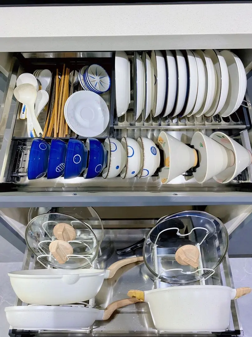 每次做完饭洗完收拾后,把碗和常用锅进行的收纳,整个厨房台面干净整洁。