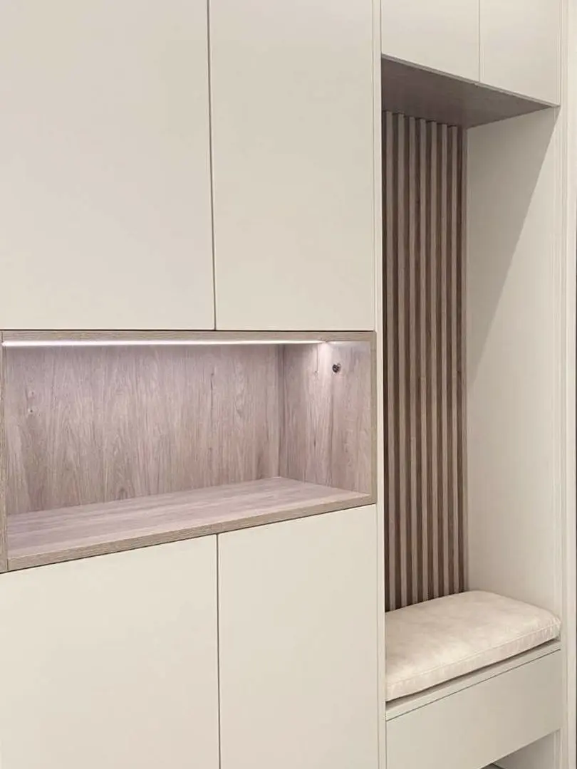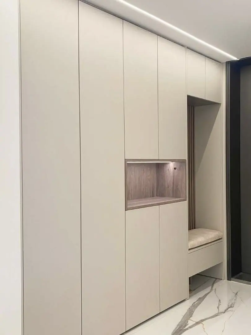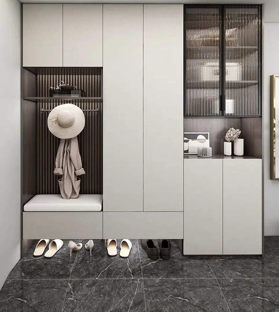 2、玄关柜一般包含换鞋凳、壁龛可以放钥匙或者小物件,常鞋位,还有挂衣区。
