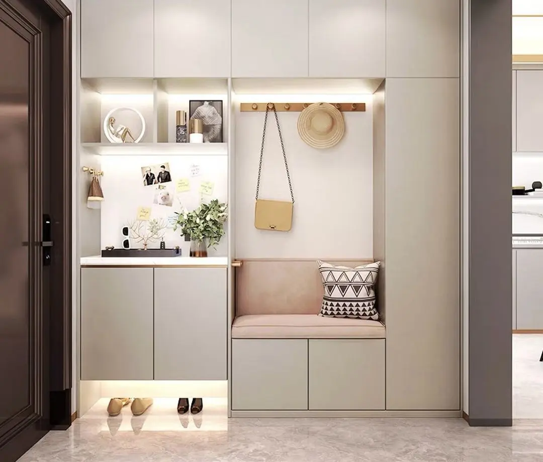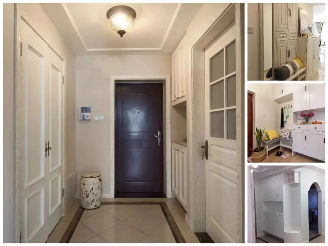 进门玄关位置最好有一个独立的玄关柜,玄关柜的设计可以增加更多的储物功能,同时也能保证一定的隐私安全。