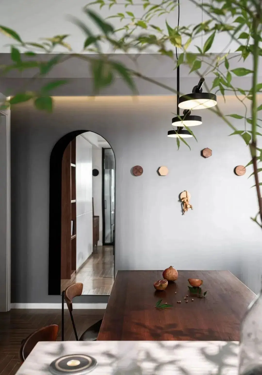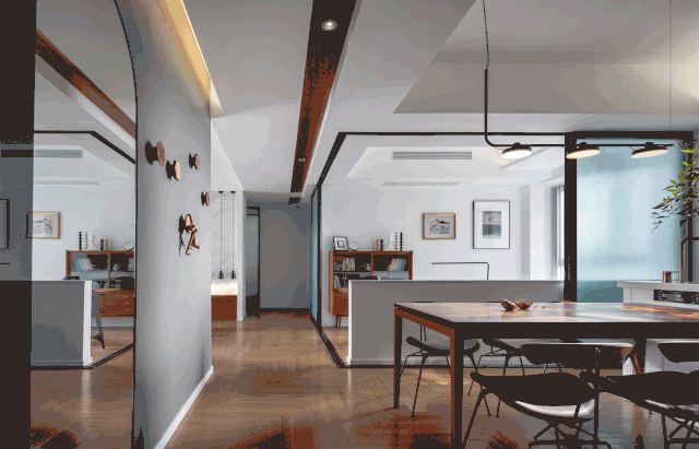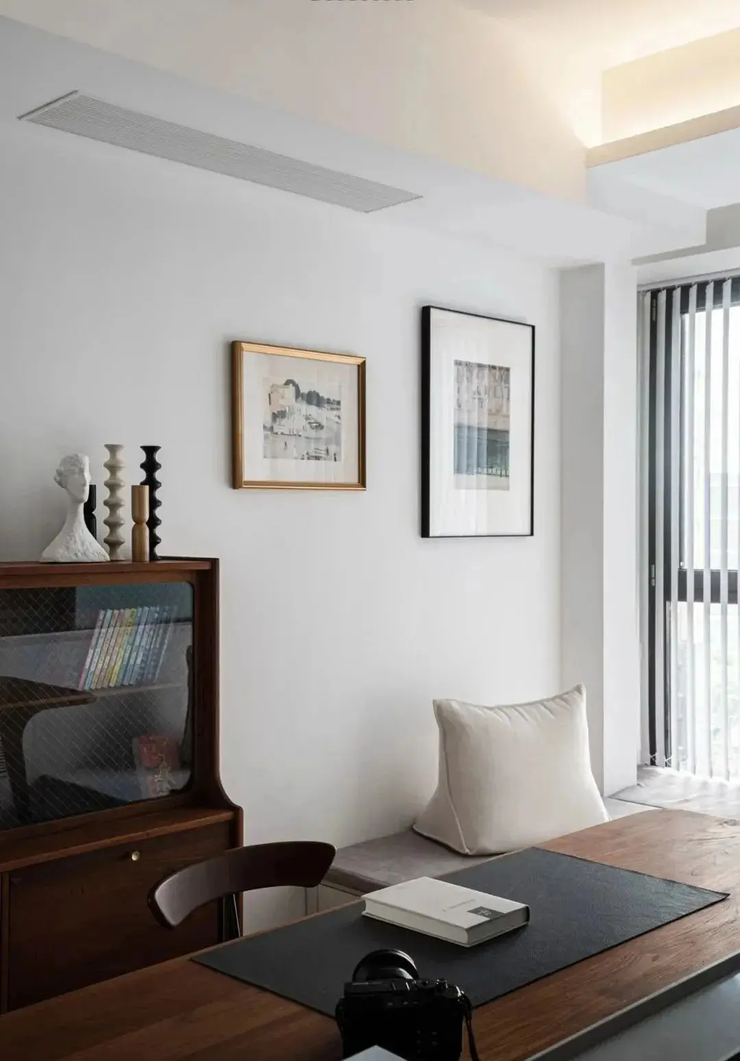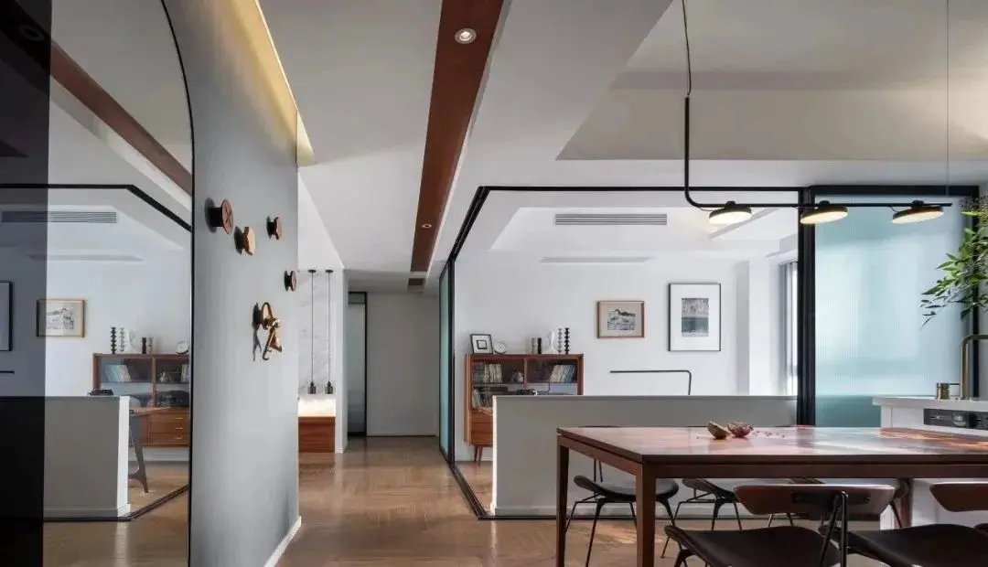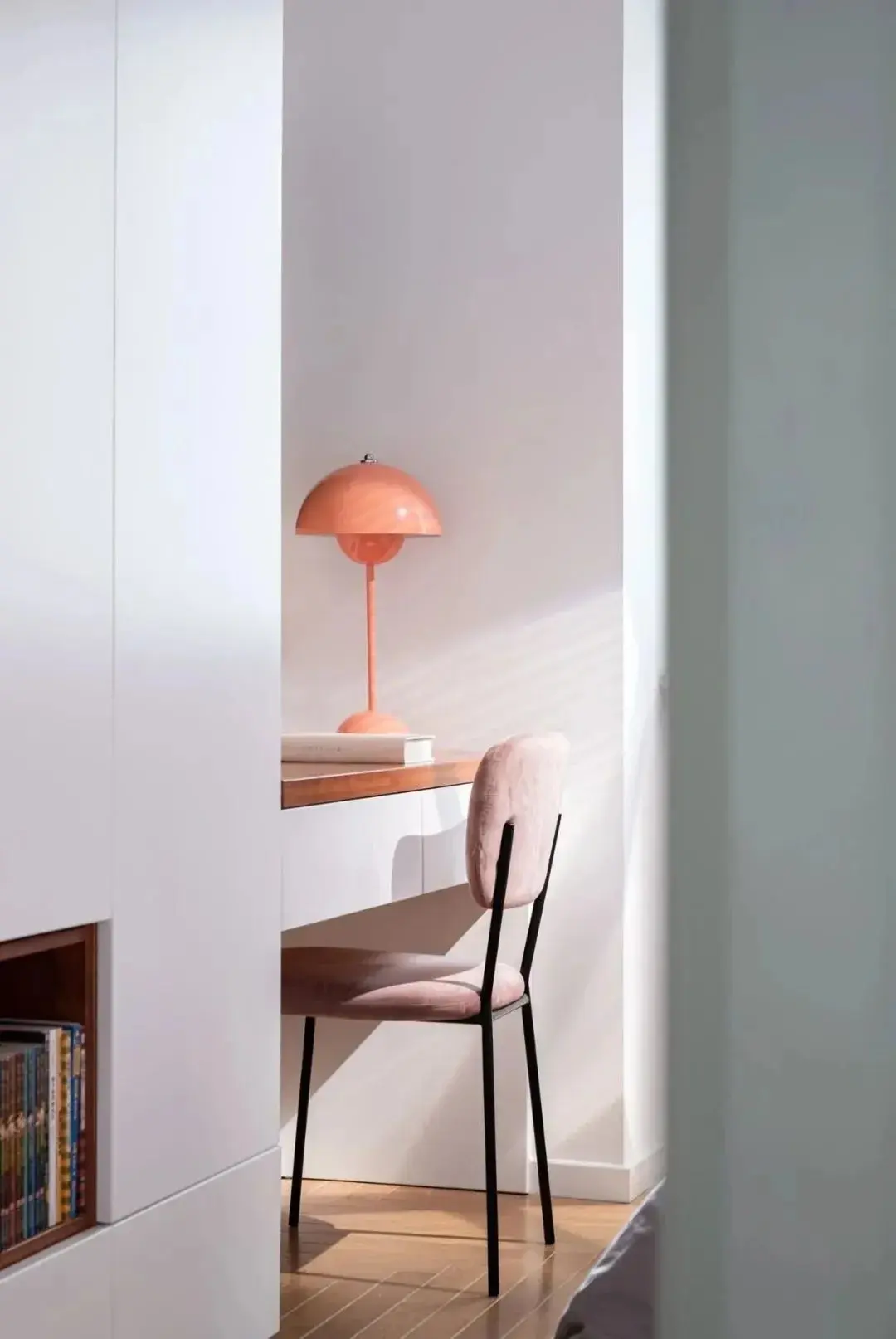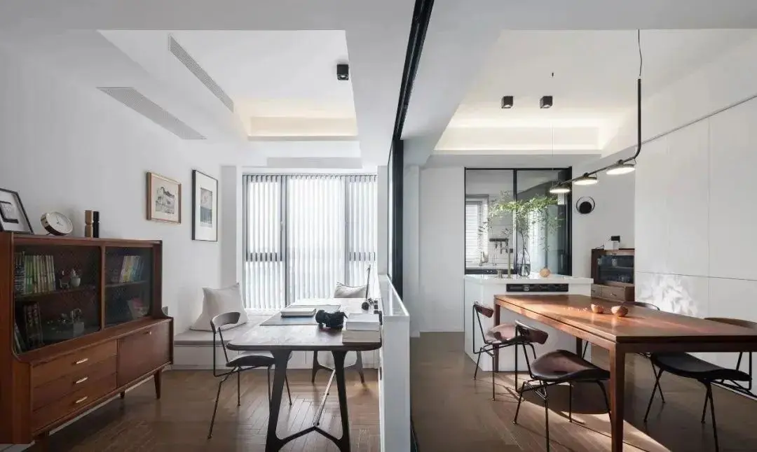 书房与餐厅之间酝酿出更加开阔的视野延伸,半墙隔断上方进行了U型凹口设计,放些小小件物品时不易滑落,体现了设计的小心思。