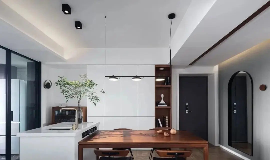 中岛台连接餐桌,时尚的设计感营造高逼格的用餐空间,美观的同时又不乏实用性,岛台底下也是满满的收纳空间。