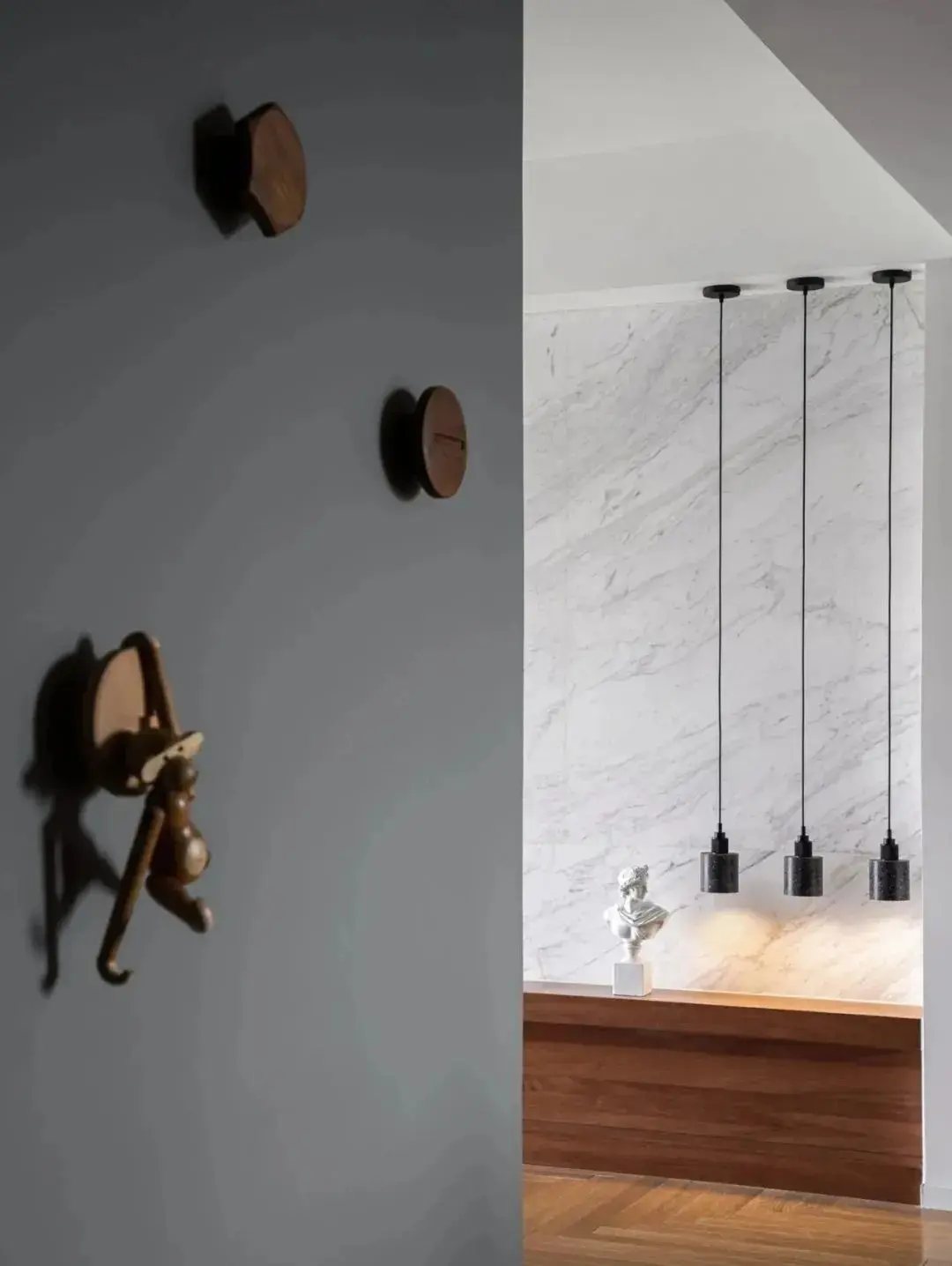 高级灰背景墙搭配ins风月牙黑镜面的全身镜还有高低错落的原木挂钩,简单大气同时也满足了入户时衣物的悬挂和出门时的仪容整理的功能需求。