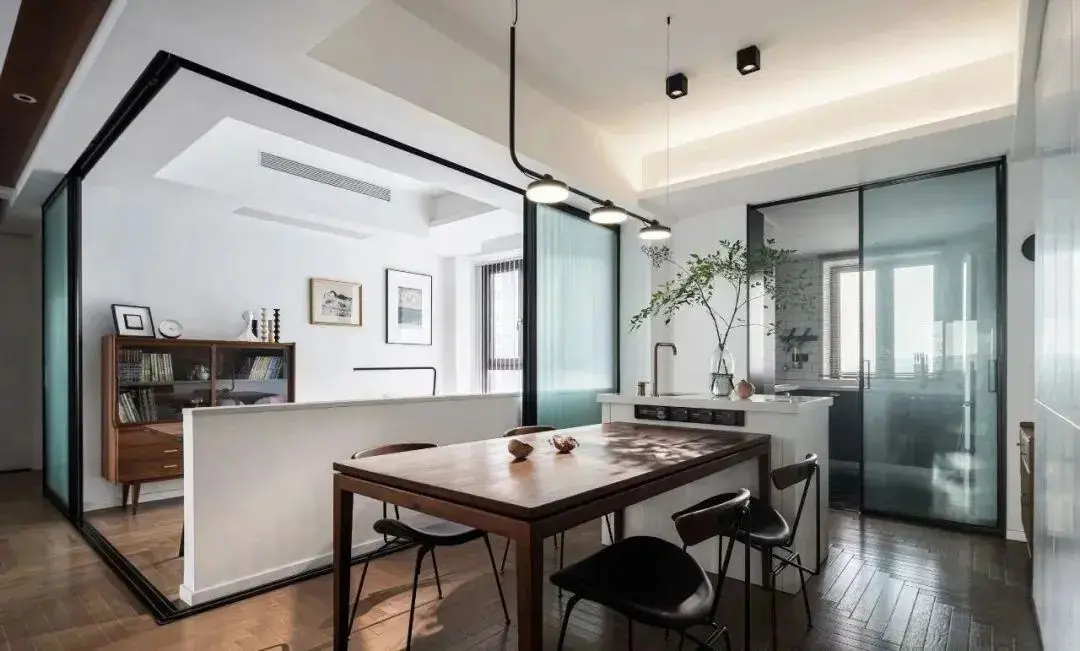 一进门的视野通透敞亮,设计师采用半墙隔断和玻璃移门的组合形式进行区域分割,让室内拥有超好的自然采光条件。