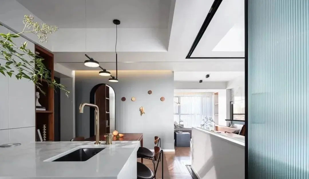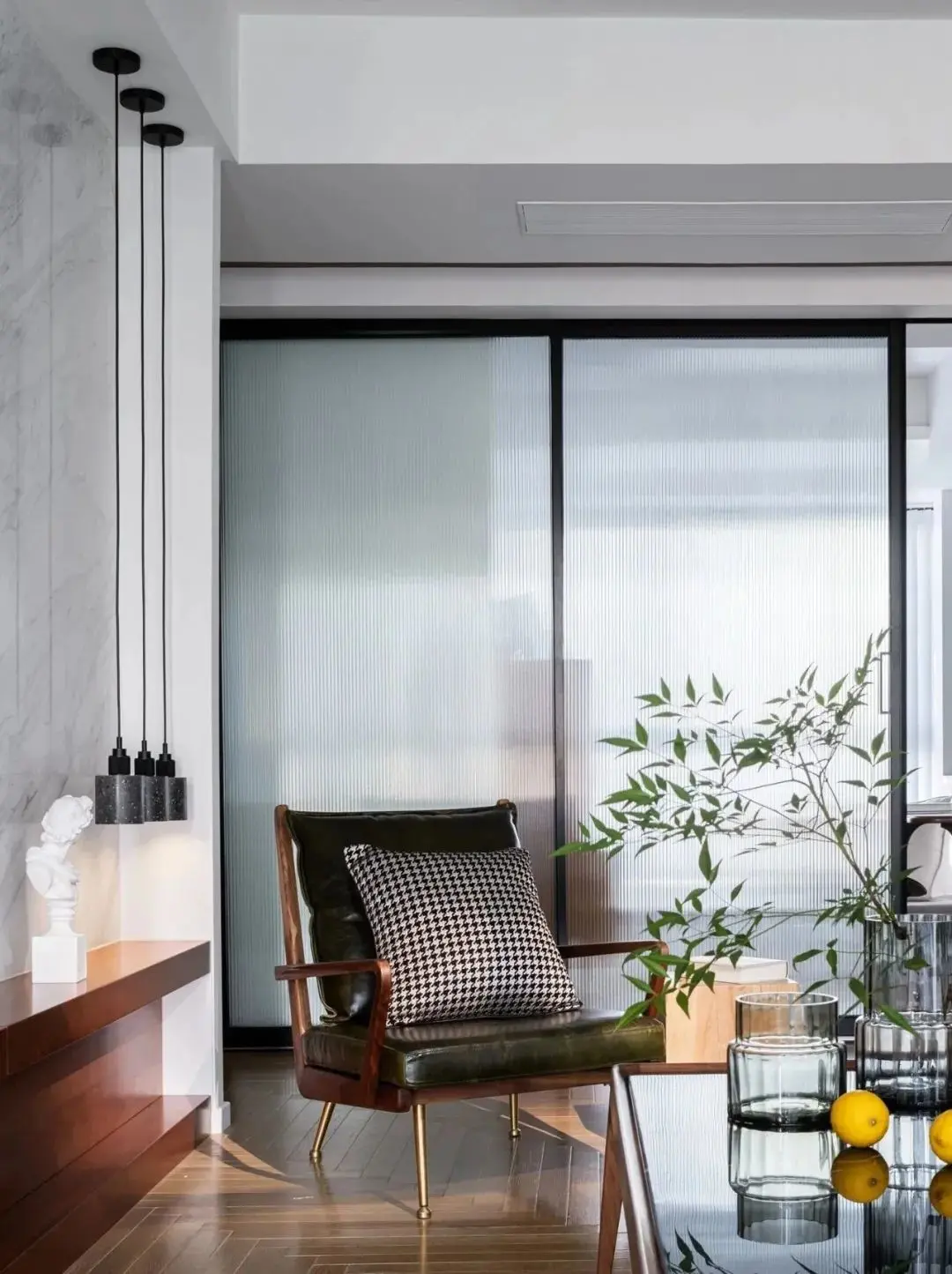 半通透的长虹玻璃在界定空间的同时又不妨碍视觉的延伸,自带模糊的雾面让映入的光线更具朦胧美感。