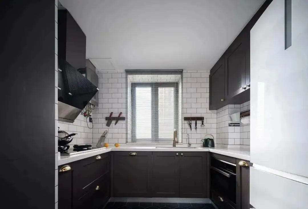 厨房,白色的小条砖墙面和黑色的六角砖地面中间用深灰色橱柜进行过渡和衔接,组合成黑白灰主色调的厨房空间,洗碗机和烤箱嵌入地柜,让空间更加完整统一。