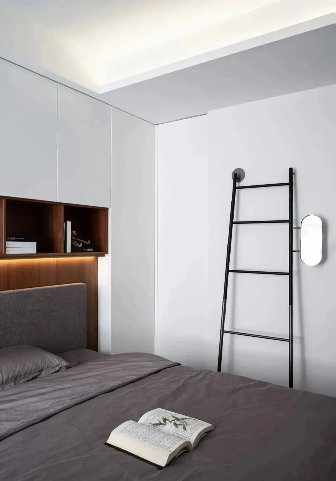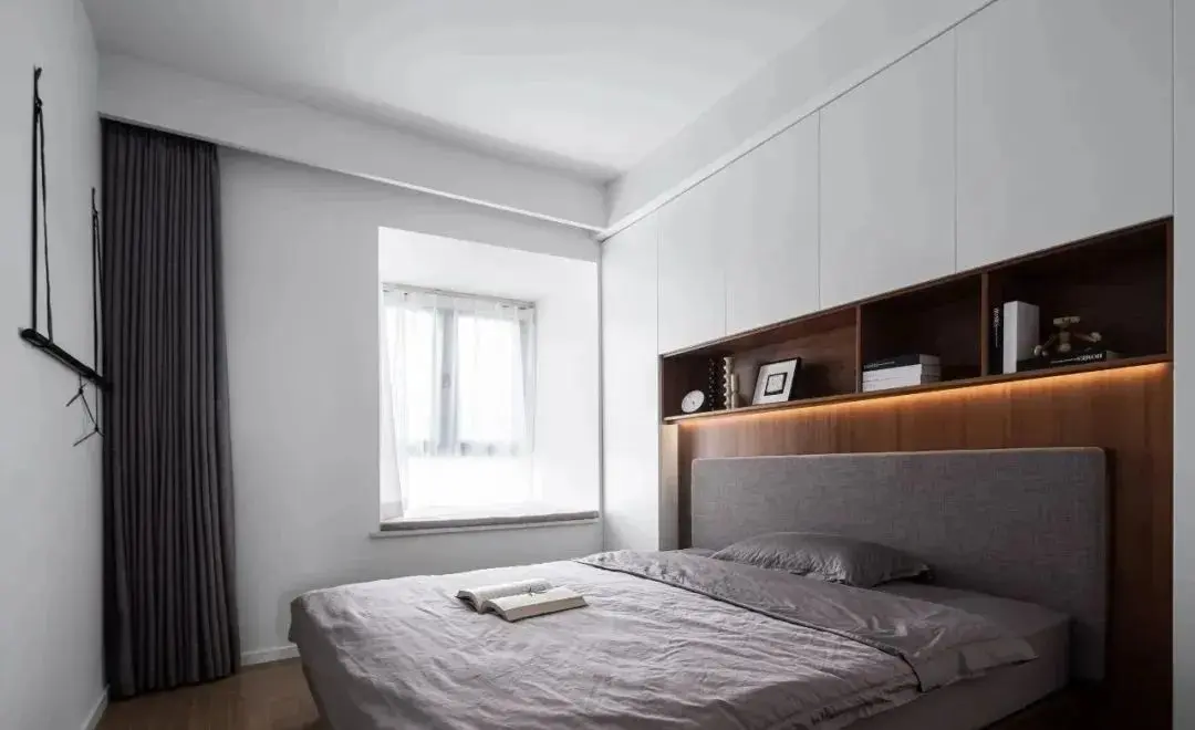 主卧定制了一款收纳功能强大的床头一体柜,满足了主卧必备的衣物收纳。在床头上方的开放柜,满足睡眠时间需要摆放的手机、眼镜、书籍等,功能和美观一个不少。
