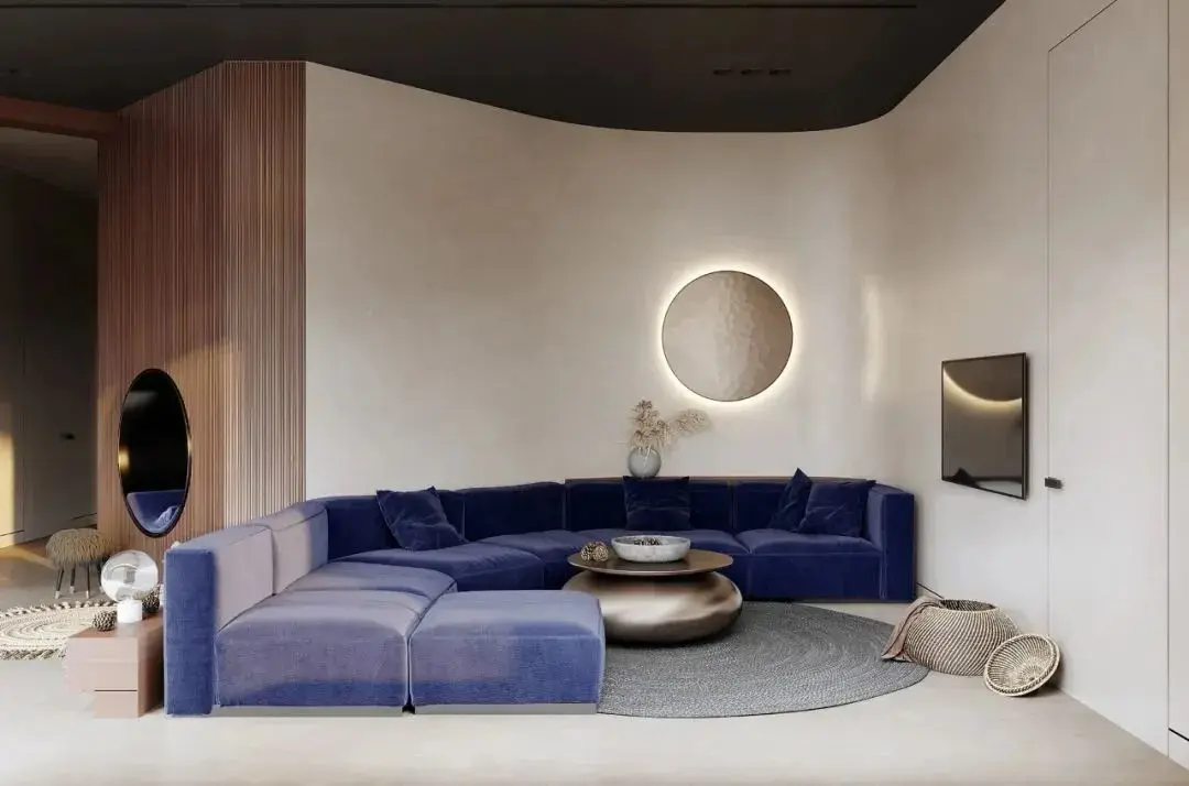 在这个组合中,灰白色和蓝色融为一体,形成了一个充满诗意的画面。白色象征着天空和广阔的空间,而沉稳可靠的蓝色沙发则像一朵漂浮在其中的云彩。这样的组合不仅令人思维飞扬,同时也让人感受到一种平静与温馨的氛围。