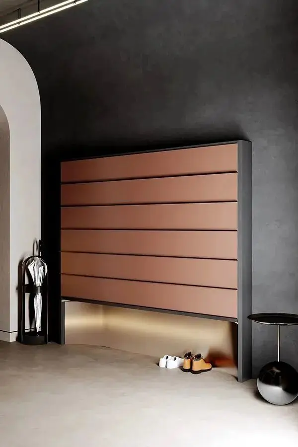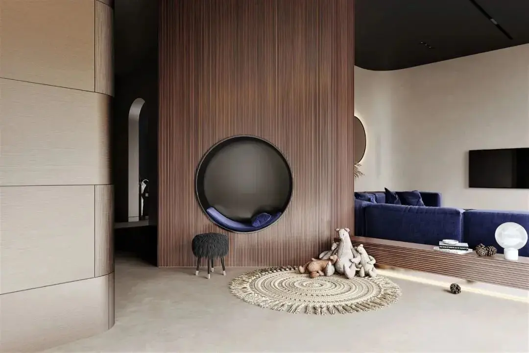 第二个圆代表着一个舒适的躺椅,它被放置在墙面上,被环绕着垂直的木纹板。而中央的圆则是一款皮革制作的艺术品,呈现出高贵典雅的质感。