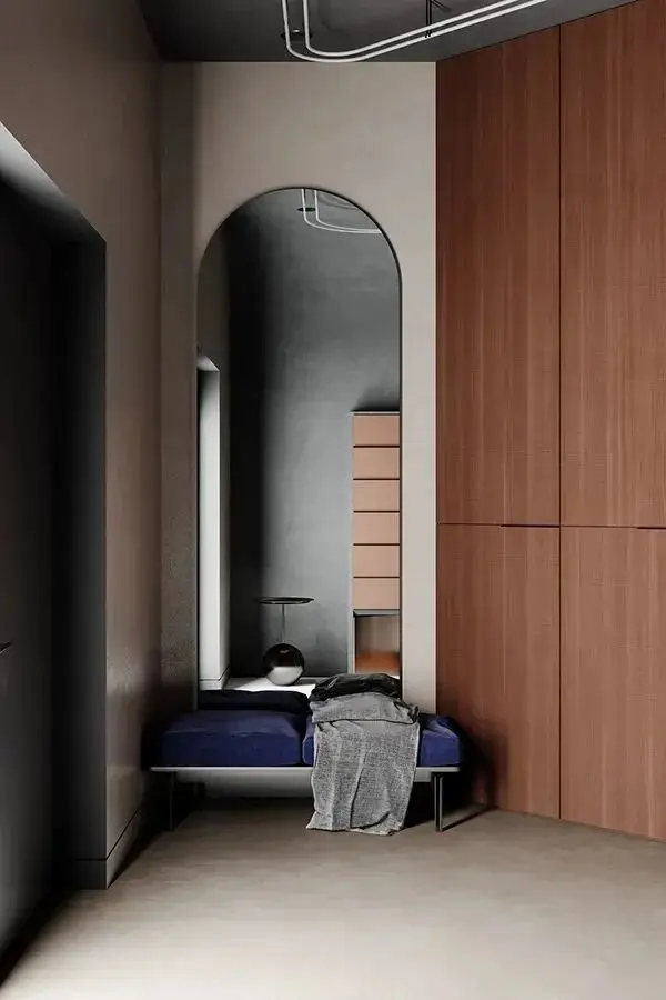 米灰色的墙面给空间带来了一股侘寂之美,但它并不简单。经过精心挑选,墙面的饱和度、灰度和亮度都达到了最优状态,既不刺眼又最舒适。弧线型的设计更是一大亮点,让本就平淡的空间瞬间焕发生机。墙面上的两个圆形设计更加增添了空间的设计感,其中一个是放置在中央的圆形镜子,反射着周围的米灰色墙面。镜子上的肌理是个细节之处,让整个设计更加精致,仿佛透过它可以感受到生活的纯净之美。