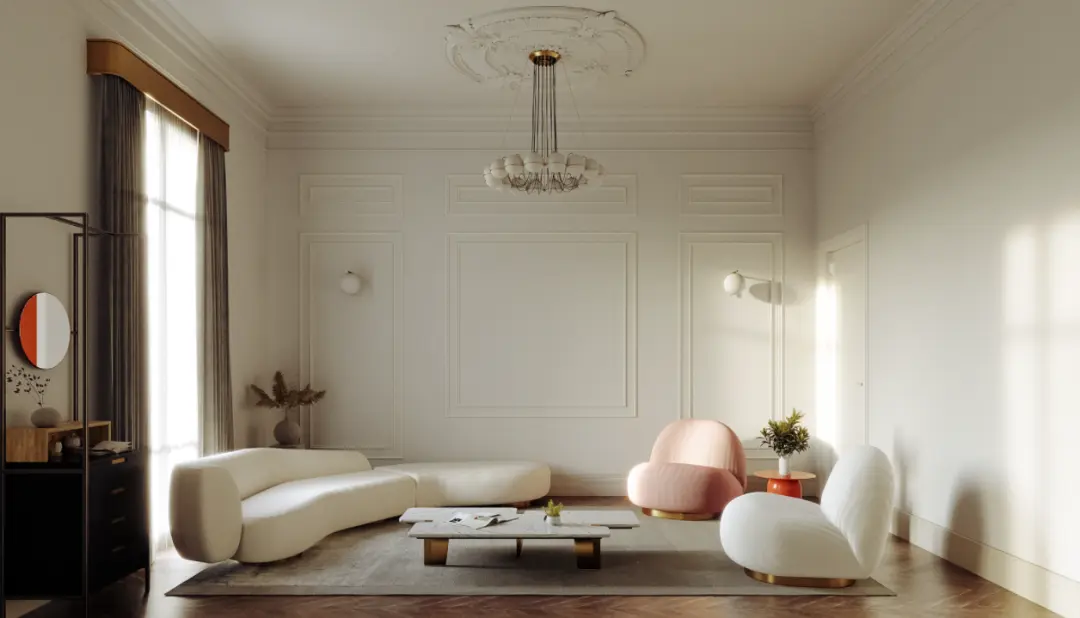 白色主题营造的无可挑剔的纯净氛围从墙面到天花板,再到精美的顶灯无处不在。简洁的线条恰到好处地点缀着空间,纯色或浅色的圆弧形家具与金属边框的底座巧妙地融合,形成了精致的白色+粉色+金属色的优雅搭配。这一组合一直以来都是典雅之选,点亮了整个空间的生命力。