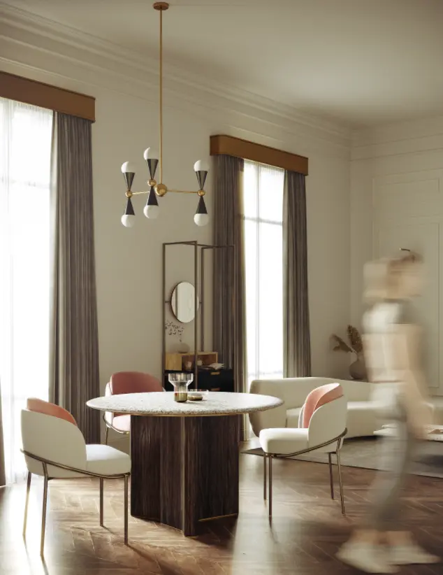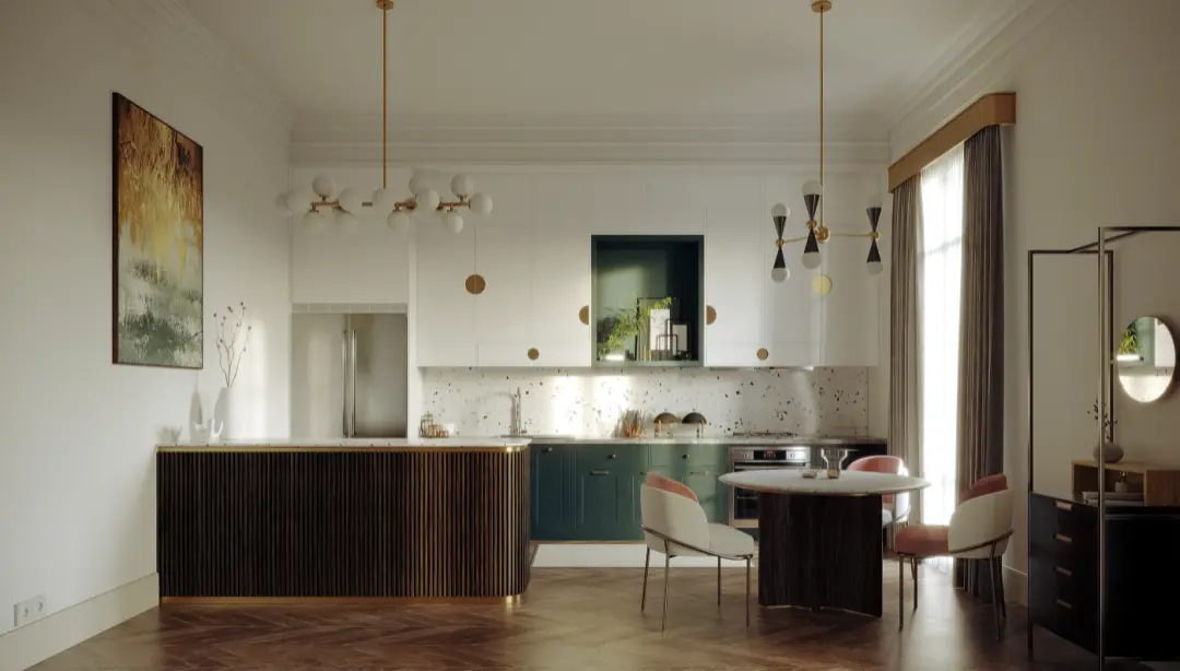 餐厅和厨房采用了相同的简约设计,金色点缀更是锦上添花。橱柜门上的圆点和半圆点缀如音符跳跃,为空间注入了活力与灵动感。