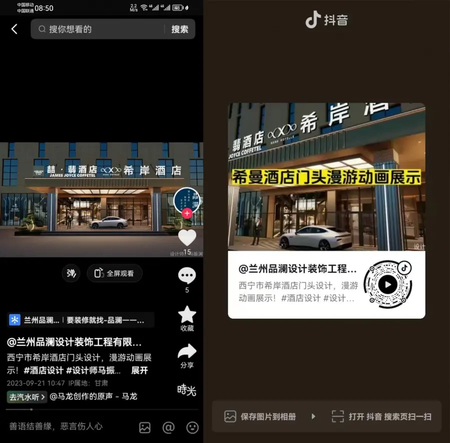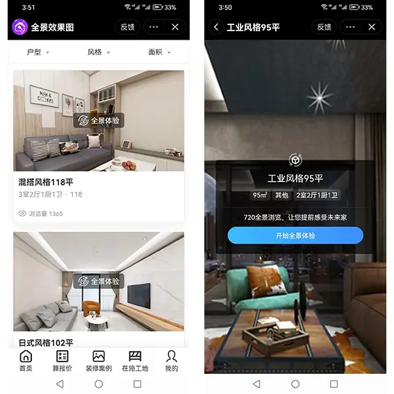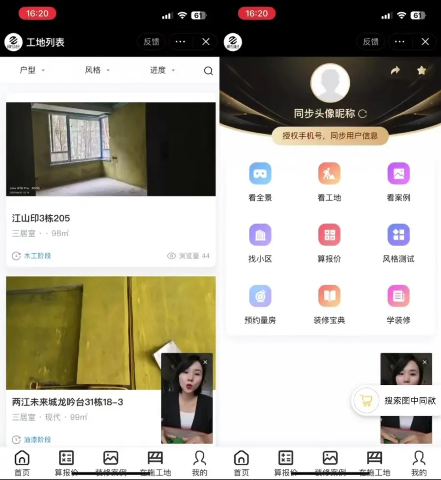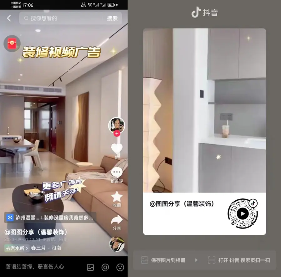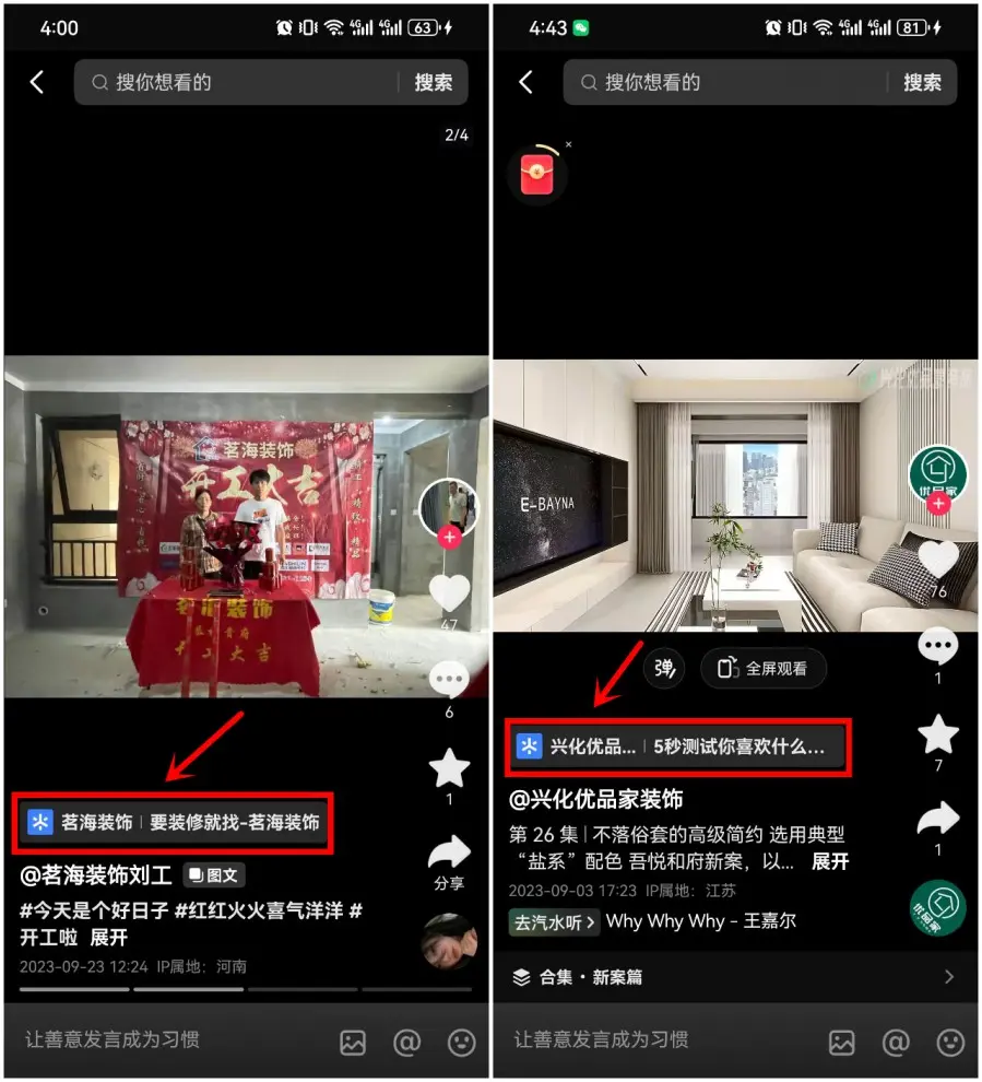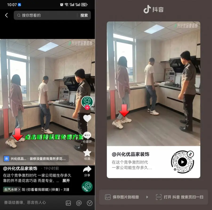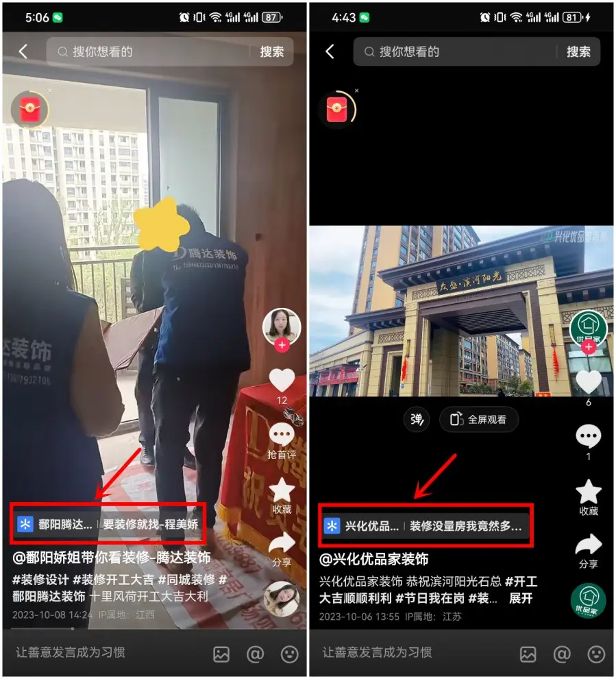 在抖音作品下方,可以挂载工地、全景效果图、案例、报价计算器、装修宝典等业主感兴趣的页面,吸引业主查看、体验。