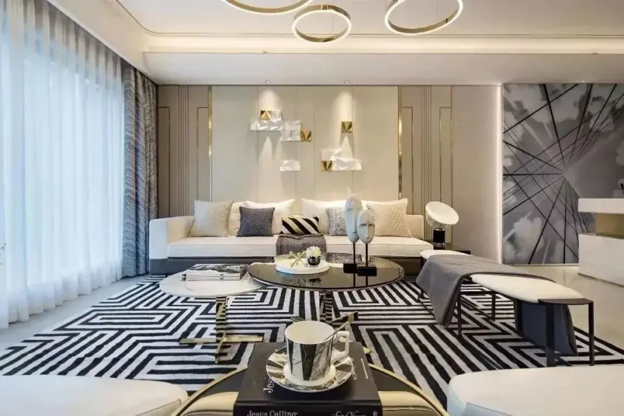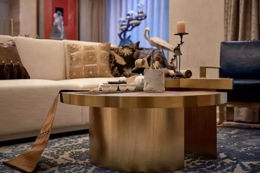 在两个长沙发摆在一起或是沙发的体积很大的情况下,矮茶几则是正确的选择,矮茶几的高度最好和沙发坐垫位置的高度持平。