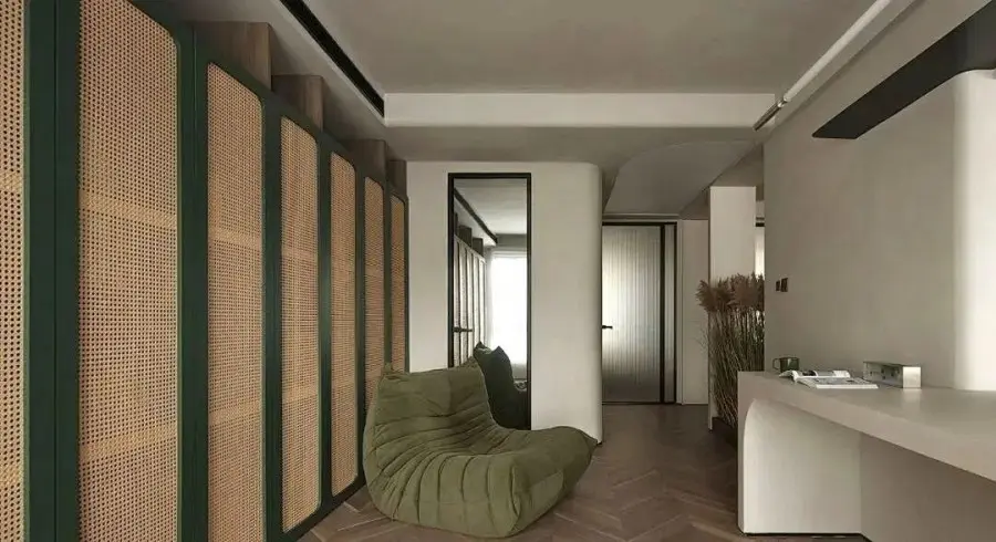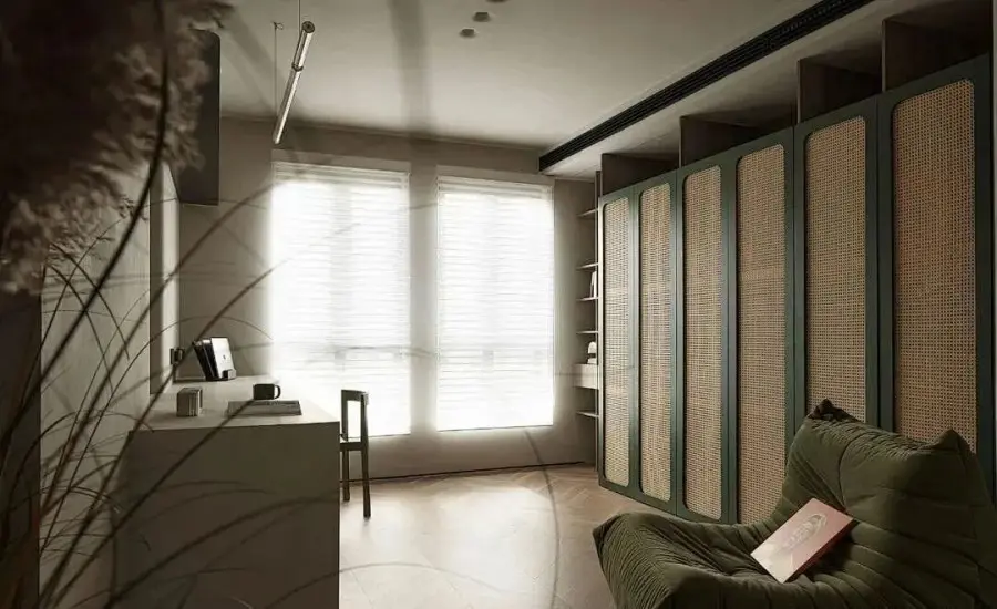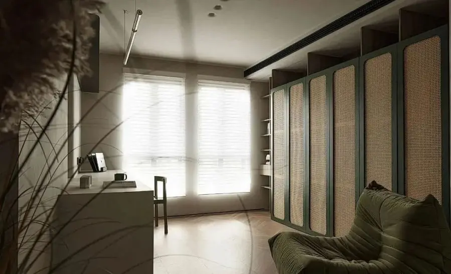 书桌对面打造整排收纳柜,藤编柜门与客厅电视柜、芦苇相呼应,产生强烈的视觉统一感。