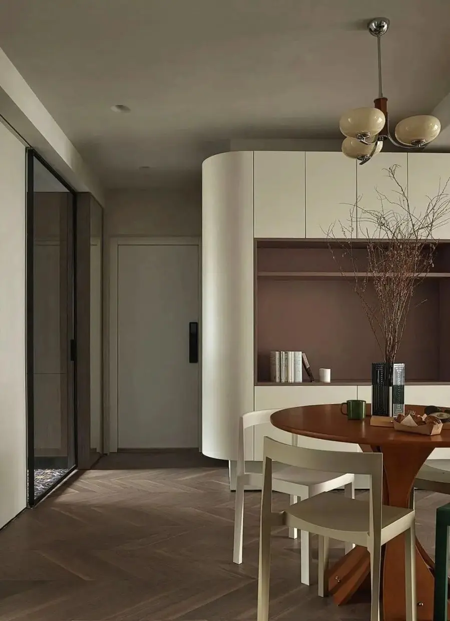 客餐厅以奶茶色为主调,独特质感的艺术漆在墙面上创造出柔和、浪漫的氛围,为了不压低层高,设计师选择让房梁裸露在外,中央空调设置在偏阳台一侧,玄关柜转角至客厅,集餐边柜、电视柜、收纳柜于一体,大大提高公共区域的收纳能力,柜体上下留空,增加了“呼吸感”。