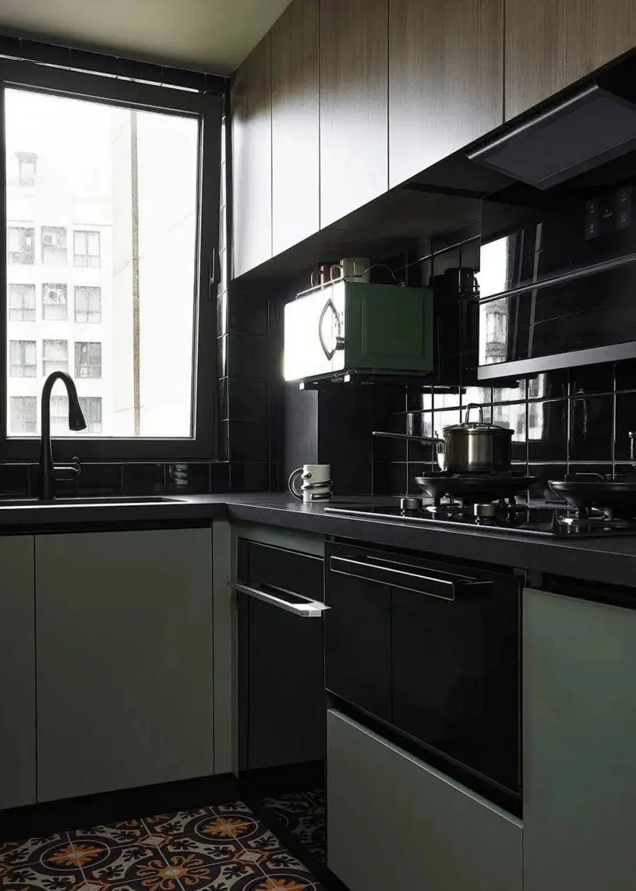 进门右手边是厨房,墨绿色橱柜搭配花砖地面,很有复古韵味,在尽量不牺牲台面的情况下,做收纳的补足,碗碟架、置物架、拉篮等,一应俱全。