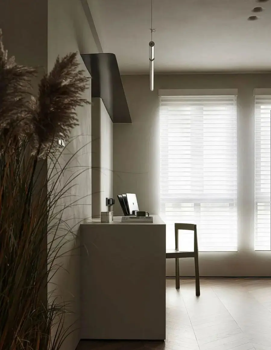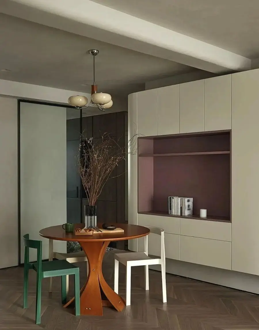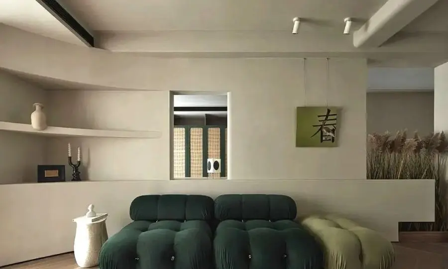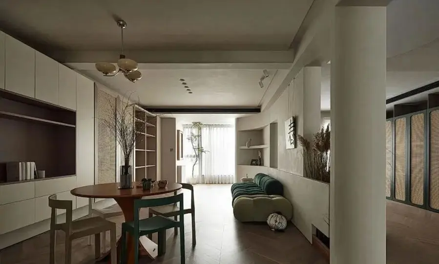 一套面积110㎡的中古风混搭三居室,屋主是一家三口,夫妻俩和一个儿子,平时不太会有人来住,丈夫注重材质,妻子讲究情怀,他们对“家”都有着很强的包容度,在110㎡的空间中,设计师很好的提炼了中古、侘寂、中式等多重风格,融合功能需求,又置入芦苇、透景、挂画…相映成趣,又各自相生,给人带来一种平静和轻松的感觉。