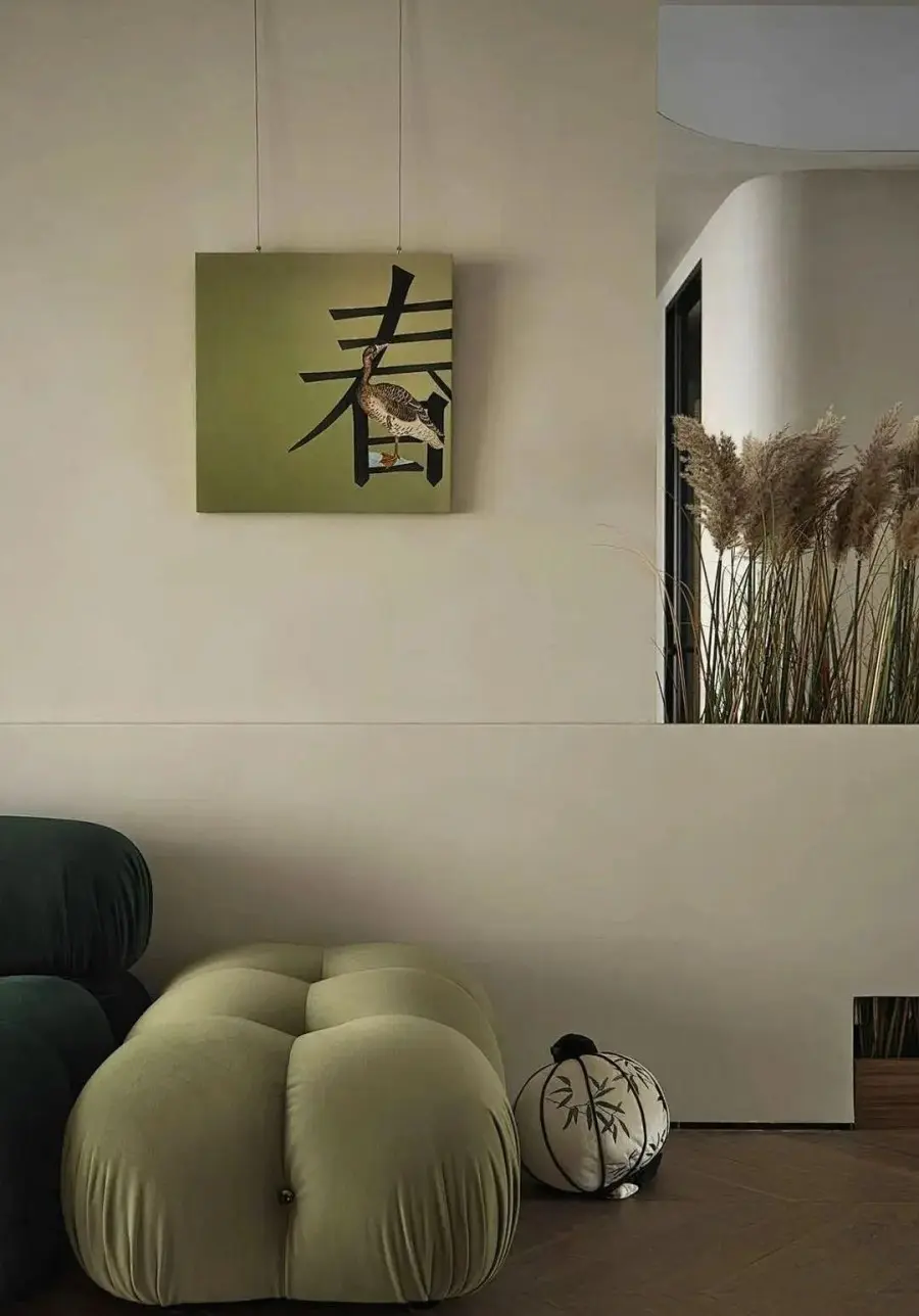 沙发另一边的芦苇、透景、挂画,成为家中一个很好的造景点,尽显东方意境之美。