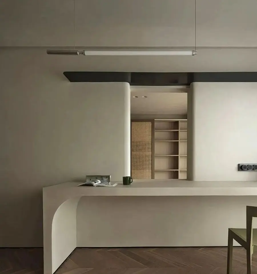 开放式书房现场定制3米长的书桌,满足屋主日常办公需求,立面设计嵌入式钢板,可作为书架或展示架使用。