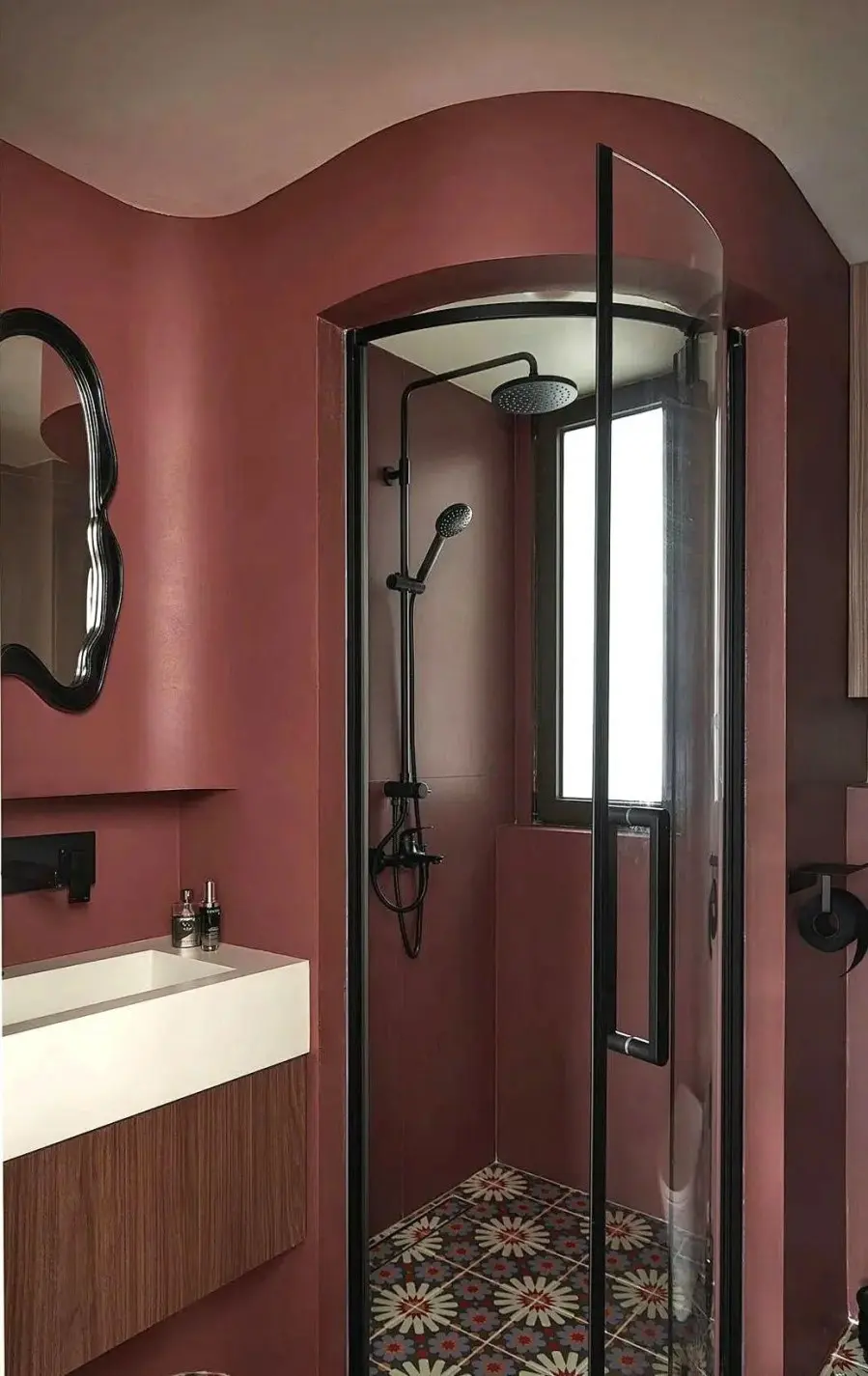 淋浴区的弧形墙是现场砌的,同样选用红色,达到完美的视觉效果,淋浴门顶部留有空隙,使得上面空气能够流通,保障洗浴时的安全。