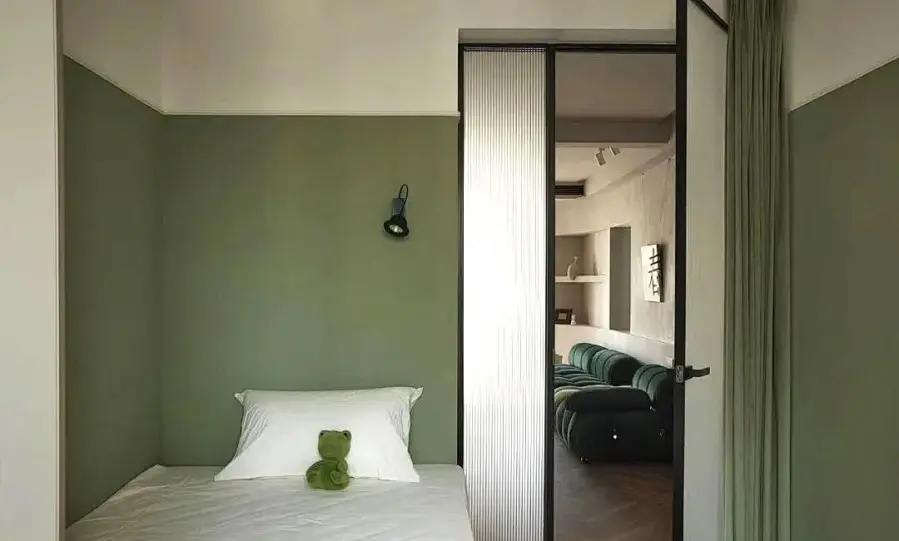 儿童房采用磨砂长虹玻璃门隔断,内置窗帘作遮挡,弱化卧室的存在感,墙面做了上下分色处理,更显活力和层次,床头一侧留空,日后可加上小边几代替床头柜。