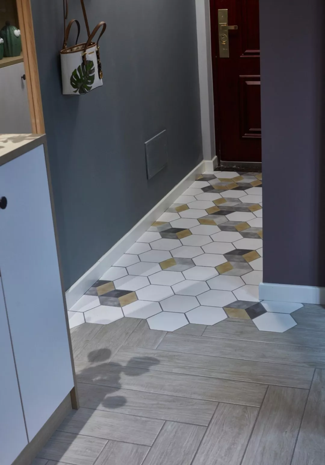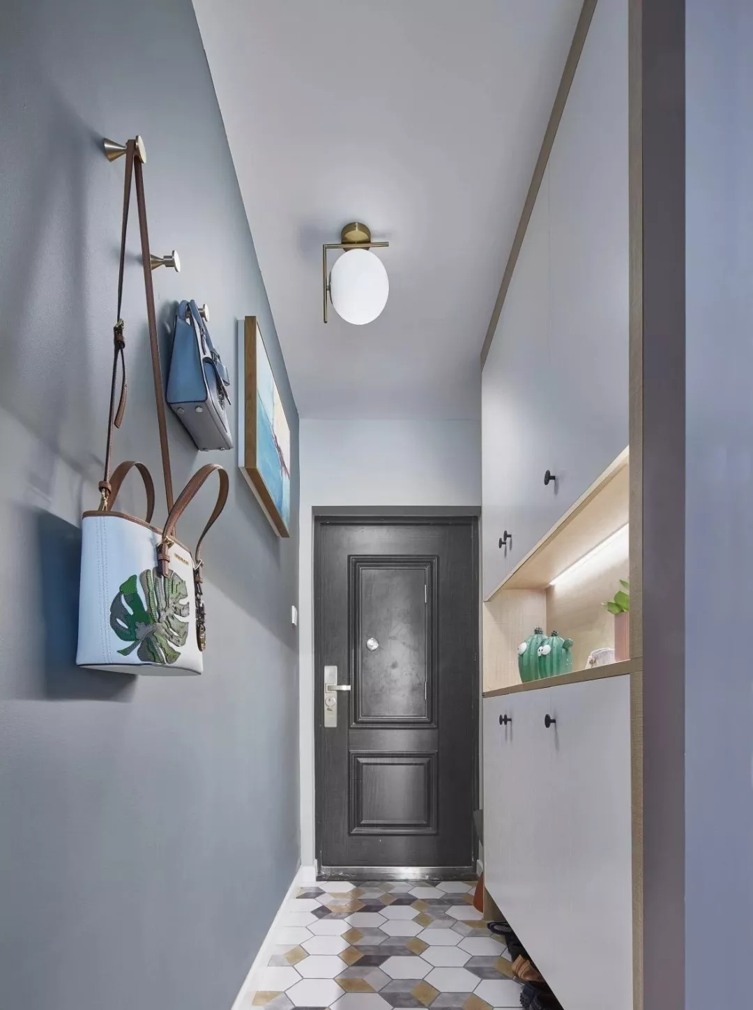 ▲玄关一开门首先进入眼球的是蓝灰色的墙面与彩色立体感的六边砖形成跳跃的对比,让空间简约又活泼,而右侧的白色入墙式鞋柜,则提供了充足实用的储物功能。