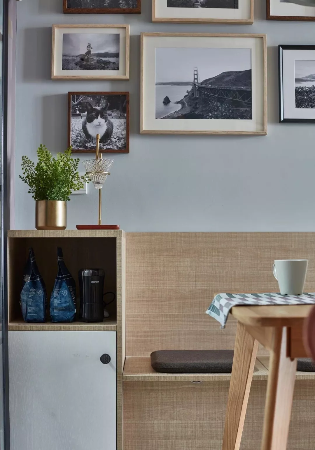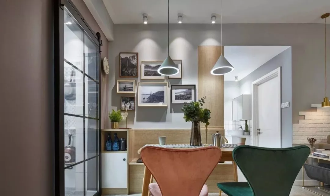 ▲餐厅背景墙挂一组照片墙,结合三盏筒灯的烘托,还有木质的墙板,带来了自然温馨的氛围感。
